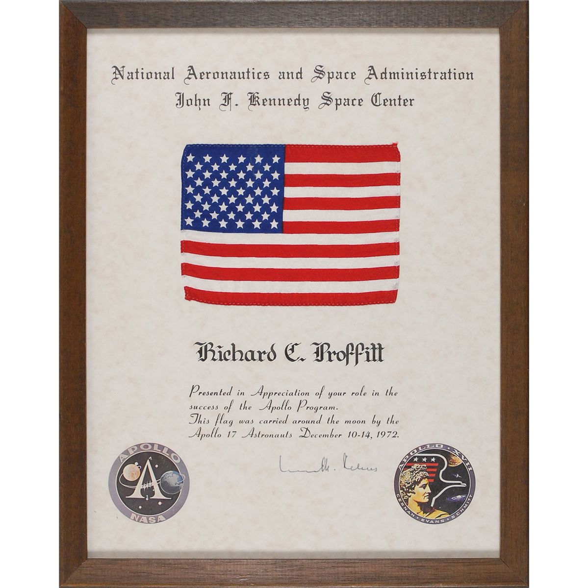 Flown printed fabric American flag, 5.5 x 4, flown to the moon aboard the America Command Module. Flag is affixed to a 10.75 x 13.5 certificate stating the flag was carried to the moon and presented to Richard C. Proffitt, “in appreciation of your role in the success of the Apollo Program. This flag was carried around the moon by the Apollo 17 Astronauts December 10–14, 1972,” and signed by a NASA official. Framed to an overall size of 12 x 15. In fine condition. Proffitt served as NASA’s Launch Complex 39 Operations Manager from 1969 to 1976. Accompanied by two 1975 letters to Proffitt, one from Director Lee Scherer, presenting the flag to Proffitt, and one inviting Proffitt to the presentation ceremony.