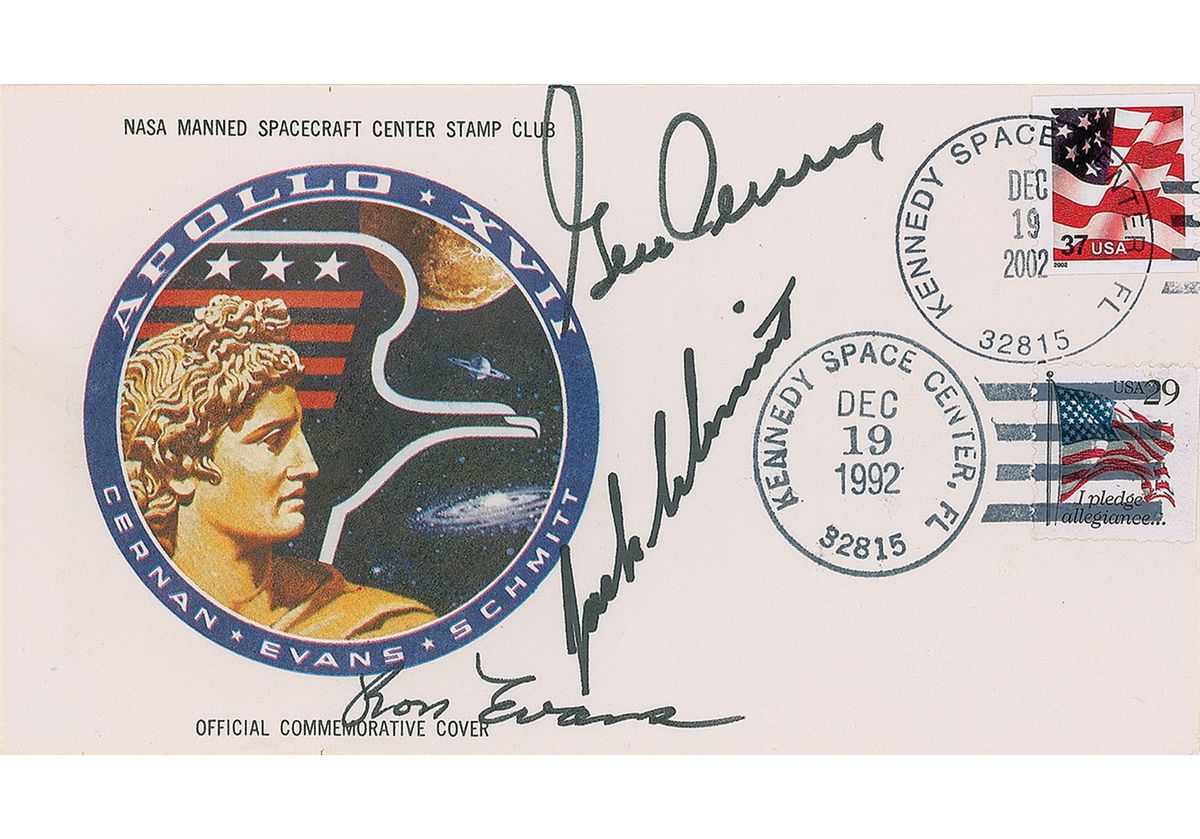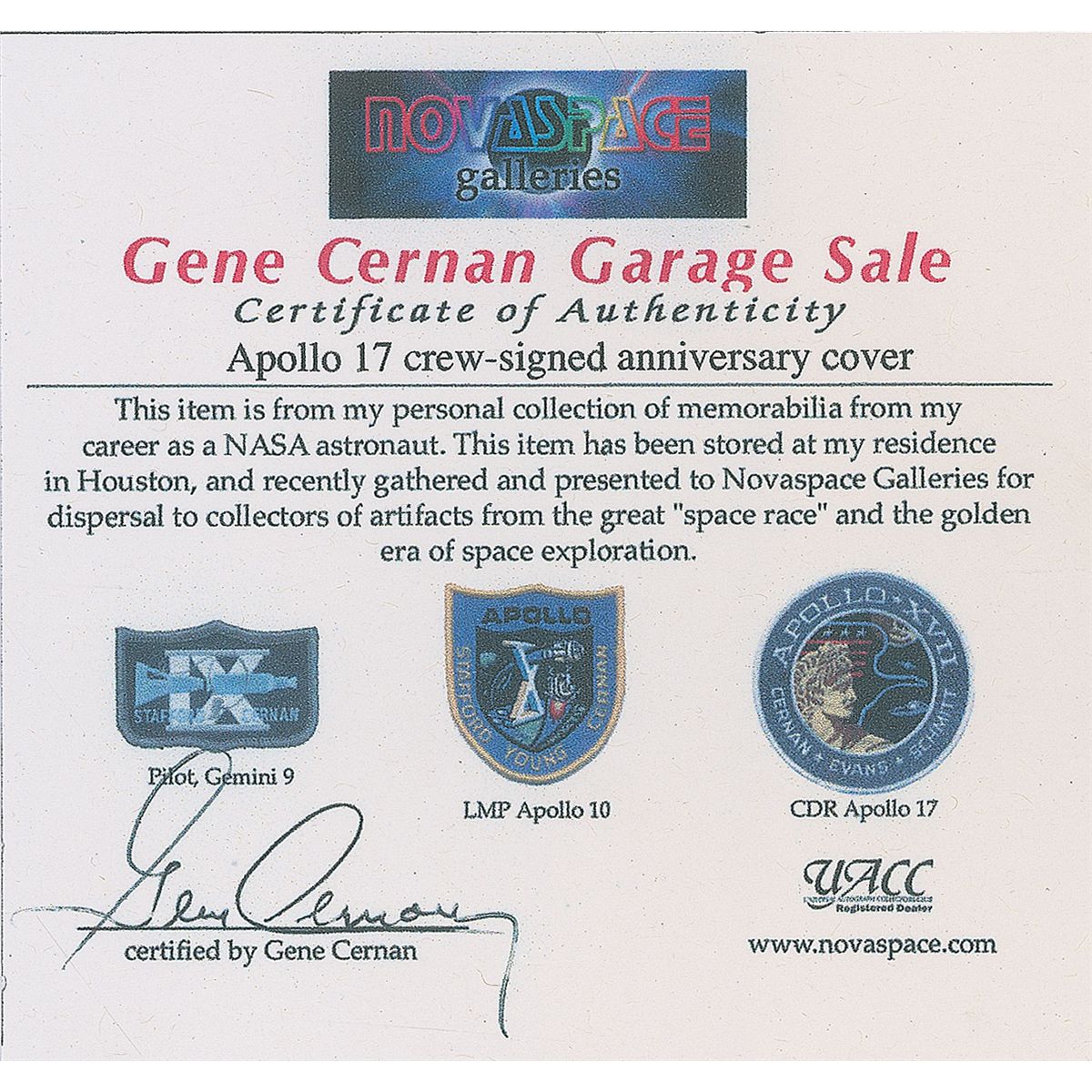 Apollo 17 anniversary postal cover with a mission insignia cachet, signed in black felt tip by Gene Cernan, Harrison Schmitt, and Ron Evans. In fine condition. Accompanied by a photocopied certificate of authenticity from the Gene Cernan ‘garage sale,’ stating that this crew-signed anniversary cover was once part of his personal collection.