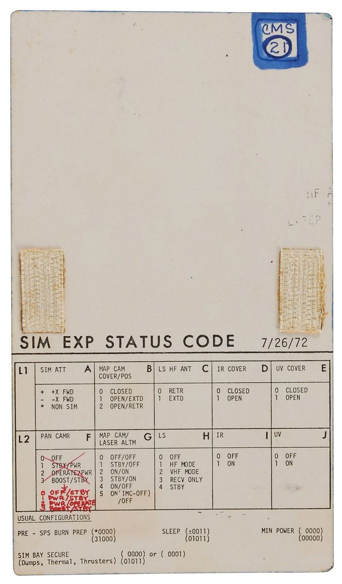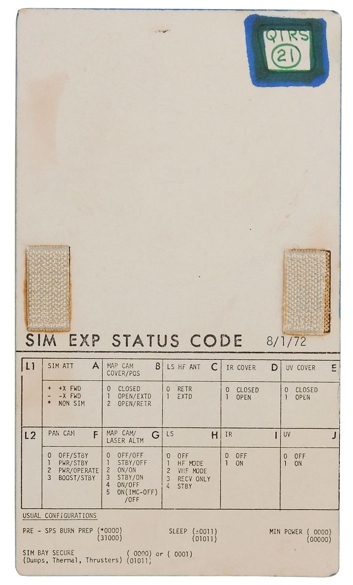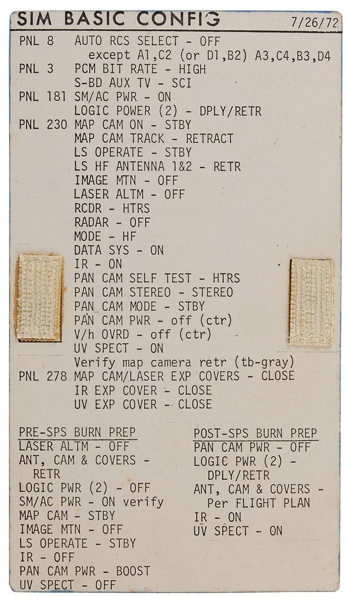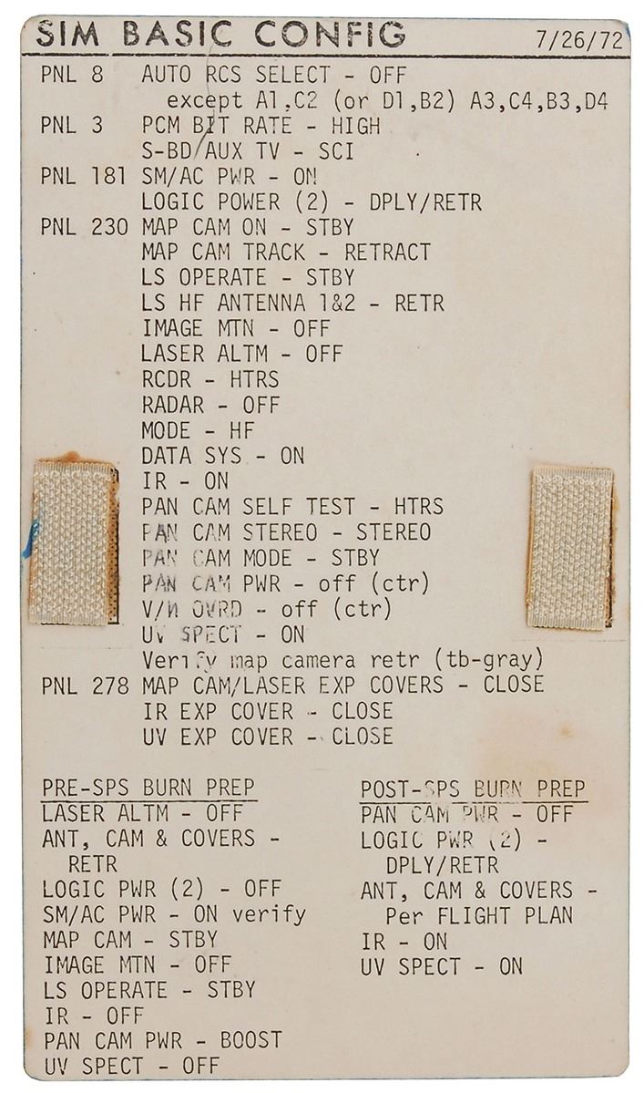 Pair of double-sided cue cards used during Apollo 17 simulation bay training, both 4 x 7, dated July 26, 1972, and August 1, 1972, with two small swatches of Velcro affixed to each side. Both cards are headed on the front, “SIM Basic Config,” and on the back, “SIM Exp Status Code,” and feature directions for panels 8, 3, 181, 230, and 278, as well as for Pre- and Post-Burn Prep. The reverse sides bear individual ink notations in the upper right corner, “CMS, 21” and “QTRS, 21,” with the former side bearing additional red ink notations in the L2-F code row, “0 off/stby, 1 pwr/stby, 2 pwr/operate, 3 boost/stby.” In overall fine condition.