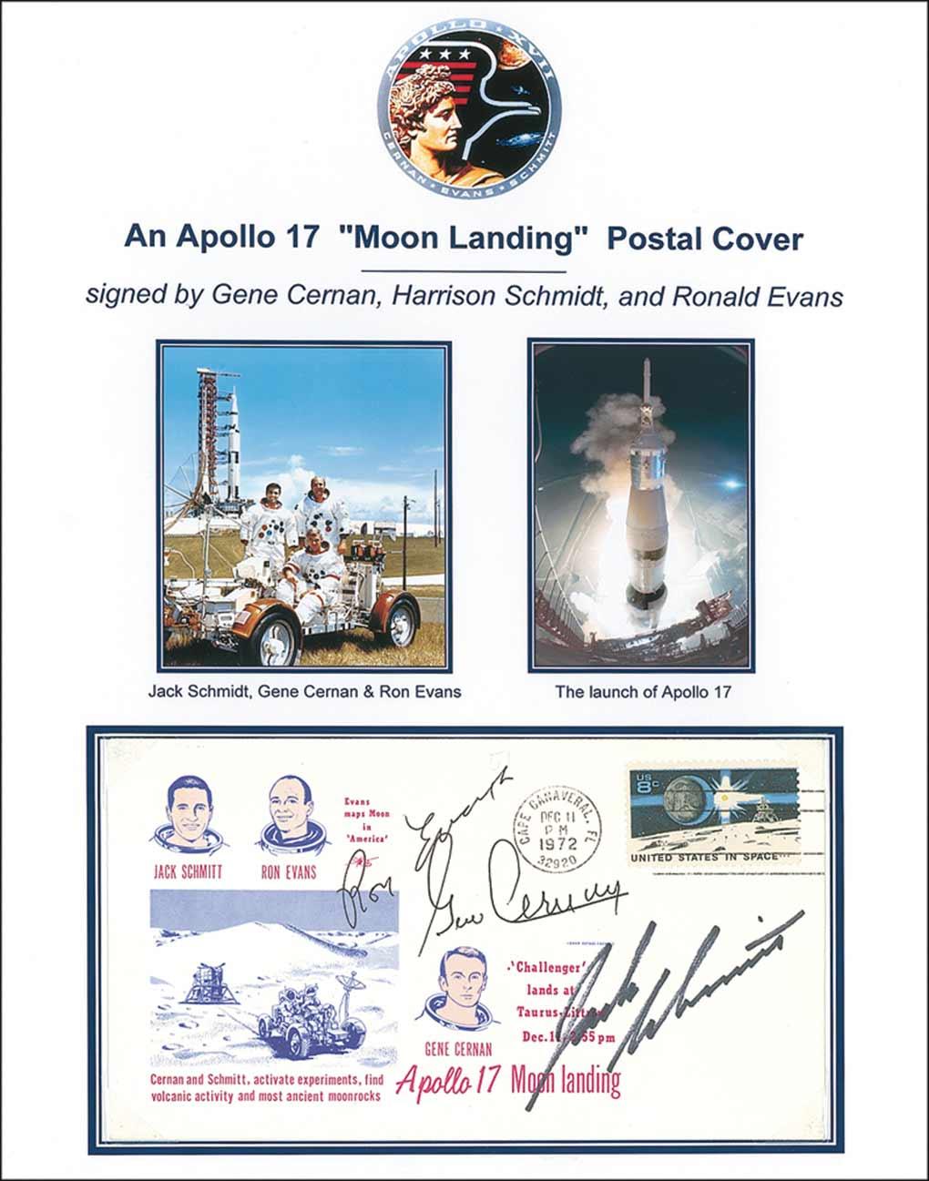 Apollo 17 moon landing postal cover with a cachet honoring the Apollo 17 moon landing, signed on the front in ink and felt tip by Gene Cernan, Harrison Schmidt, and Ron Evans. Removably presented on a color 8.5 x 11 informational sheet. In very fine condition.