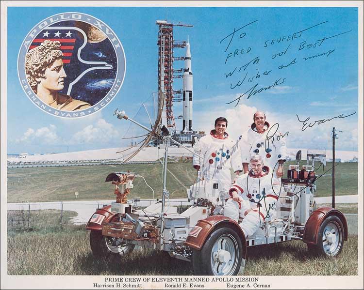 Color 10 x 8 NASA crew photo, signed and inscribed in black ink “To Fred Sevfert, with our best wishes and many thanks, Ron Evans,” and “Gene Cernan,” and signed in black felt tip by “Harrison Schmitt.” In fine condition, with a paperclip impression to top edge, a bit of light border toning, and toning and thin strip of tape on reverse. Pre-certified Scott Cornish and RRAuction COA.
