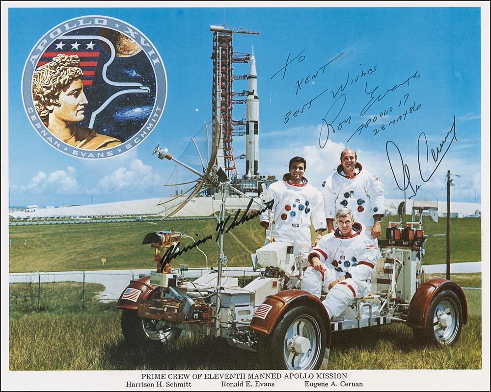 Color 10 x 8 NASA photo, signed and inscribed in black ink “To Kent, best wishes, Ron Evans, Apollo 17 28 May 86” and signed in black felt tip by Gene Cernan and Harrison Schmitt. In fine condition, with a few trivial corner tip bends and creases, and a slight brush to single letter of inscription.