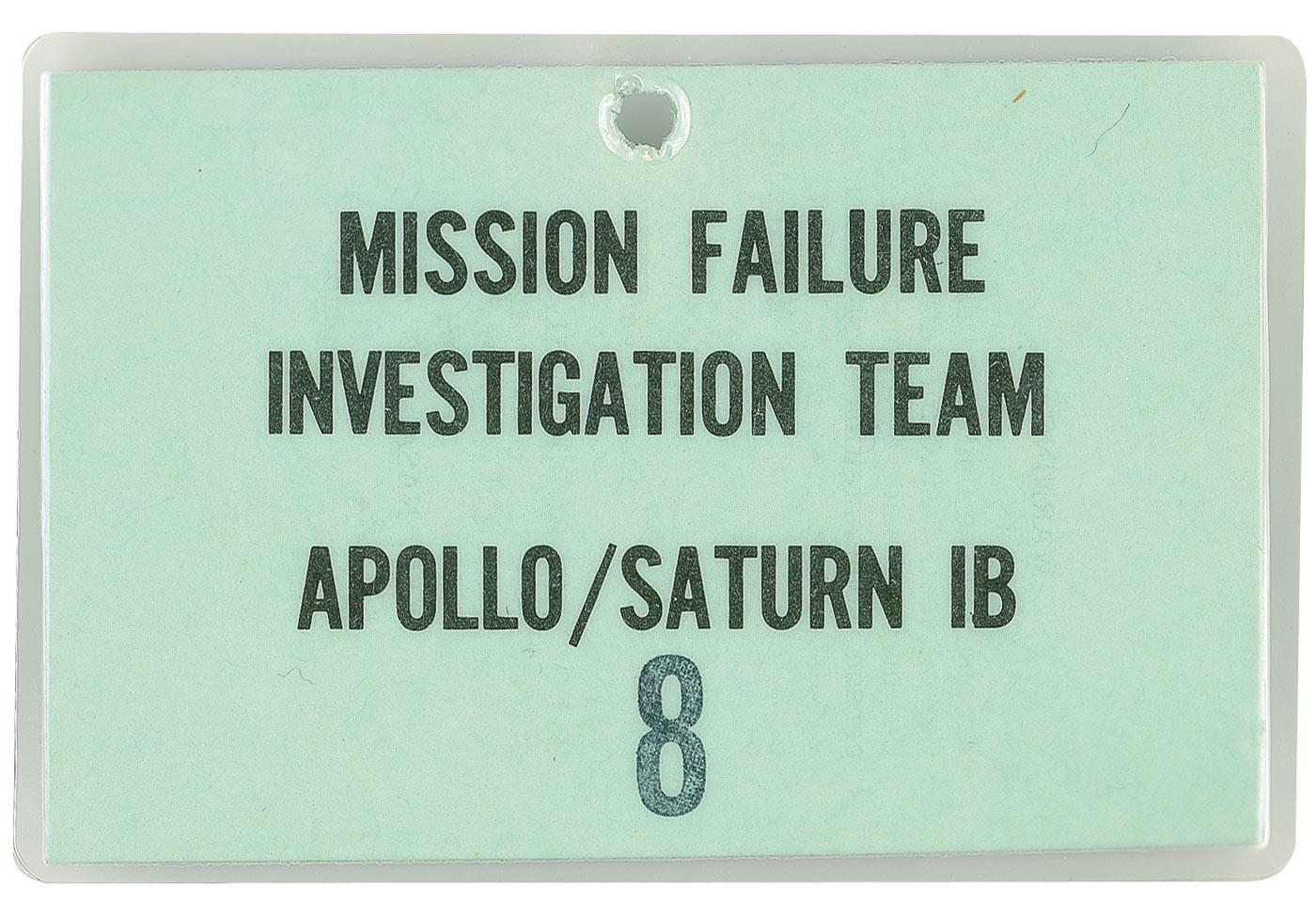 Rare Apollo 1 investigation badge #8, measuring 3.5 x 2.25. These badges were issued to and worn by personnel involved in the investigation of the Apollo 1 fire. Badge reads, “Mission Failure Investigation Team, Apollo/Saturn 1B.” It appears that those numbered from 1 to 10 were a very pale green and were issued to NASA employees. Badge has been laminated and a punch hole to top center is present. Reverse bears a printed government warning regarding unlawful possession or counterfeiting. On January 27, 1967, astronauts Gus Grissom, Ed White, and Roger Chaffee were killed in a fire while testing their capsule. The mission failure investigation team was formed to determine the cause of the tragedy, and resulted in a 20-month postponement of the Apollo program as well as many design changes.