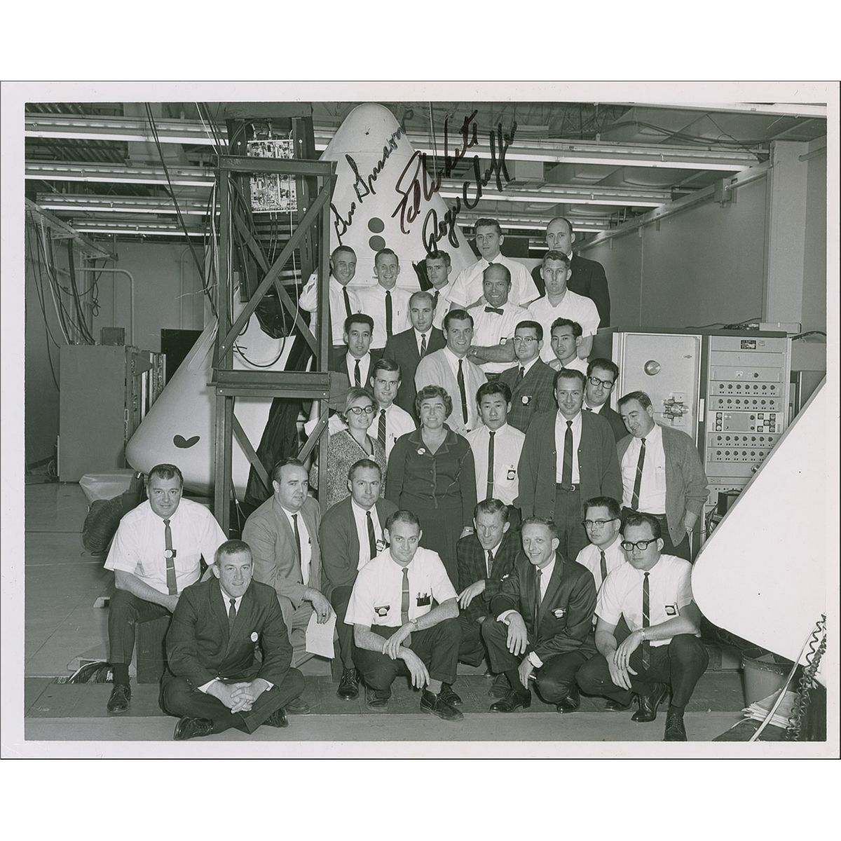 Unique vintage glossy 10 x 8 group photo featuring Gus Grissom, Ed White, and Roger Chaffee with Simulation—G&C personnel from the Apollo 1 program in Downey, California in 1966, signed in black felt tip by all three. In very good condition, with scattered mild to moderate creasing. Accompanied by a letter of provenance from Flight Simulation Manager, J. M. Robertson, stating that the featured photo has “been signed by the Astronauts in personal appreciation to those Simulation—G&C personnel who have helped support the first manned flight in the Apollo Program during the recent Training operation.”