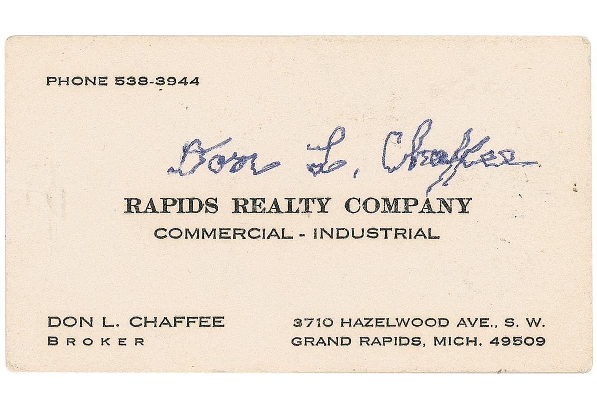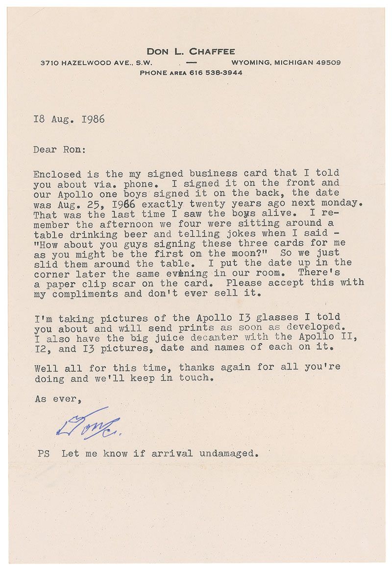 Accompanied by a 1986 letter of provenance from Don Chaffee, reading, in part: “Enclosed is my signed business card…I signed it on the front and our Apollo one boys signed it on the back, the date was Aug. 25, 1966…This was the last time I saw the boys alive. I remember the afternoon we four were sitting around a table drinking beer and telling jokes when I said—’How about you guys signing these three cards for me as you might be the first on the moon?’ So we just slid them back around the table. I put the date up in the corner later that same evening in our room.”