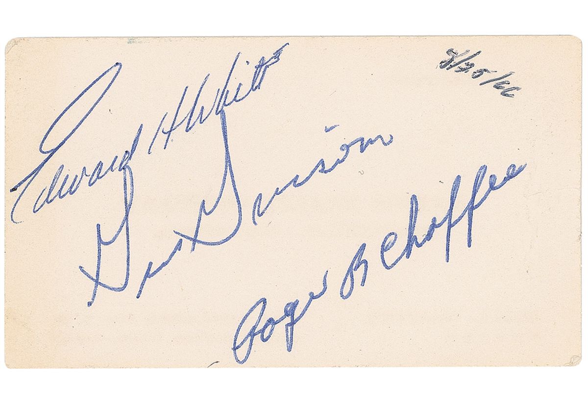 Vintage ballpoint signatures, “Edward H. White II,” “Gus Grissom,” and “Roger B. Chaffee,” on the reverse of one of Don Chaffee‘s Rapids Realty Company business cards, dated in the upper left by Don Chaffee, “8/25/66,” the day the signatures were obtained.