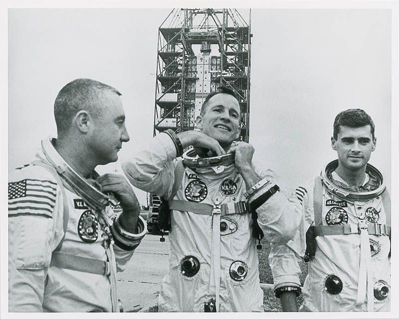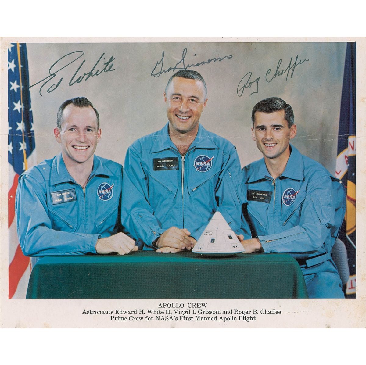 Extremely rare 10 x 8 NASA photo of the Apollo 1 crew posing in their blue flight suits with a model of their capsule, signed in black felt tip, “Ed White,” “Gus Grissom,” and “Rog Chaffee.” In very good condition, with a noticeable horizontal crease slightly above the center of the photo, affecting White’s and Chaffee’s facial areas and some scattered foxing to borders. Consignor notes that the signatures were obtained in the first week of January 1967 by a personal friend of Grissom’s after a nightclub performance in Cocoa Beach, Florida. Only 20 to 25+ Apollo 1 crew-signed portraits are believed to exist, and they are easily considered the rarest of all Apollo crew signed portraits, even more so in the case of Chaffee’s less-formal signature.