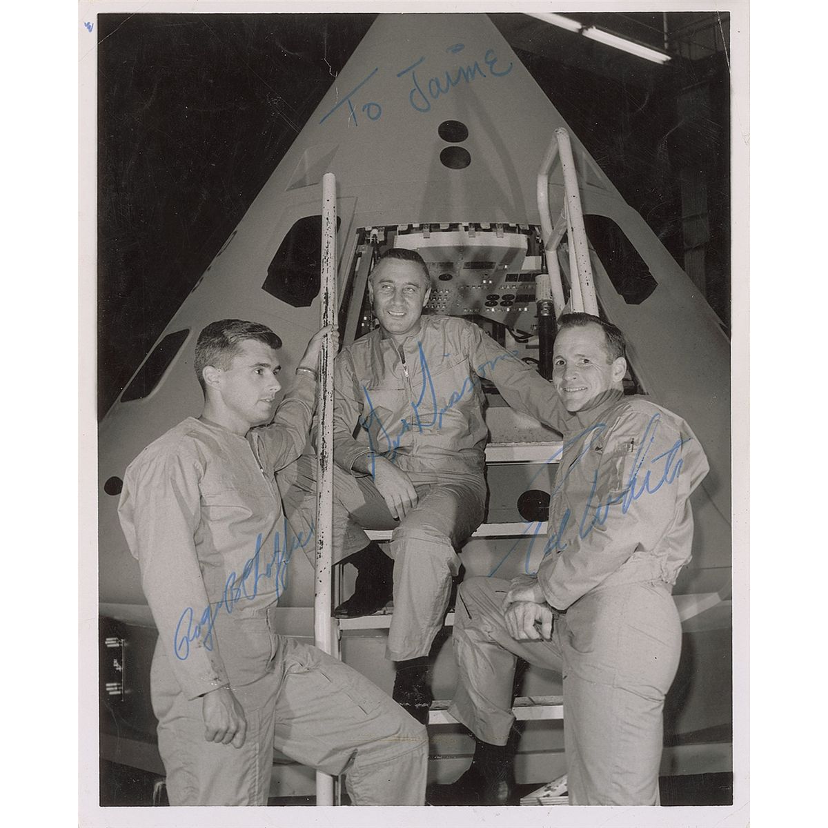 Rare vintage glossy 8 x 10 North American Aviation Inc. news photo of the Apollo 1 crew posing in front of their capsule simulator, signed in blue felt tip, “Gus Grissom,” “Roger B. Chaffee,” and “Ed White,” with a brief inscription, “To Jaime,” added later by the original recipient who presented it to his daughter. In very good condition, with scattered creases and surface marks, a bit heavier to lower right corner. The first example of this particular image that we have ever encountered.