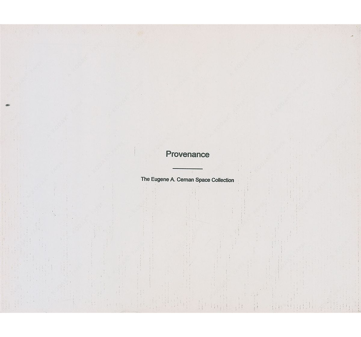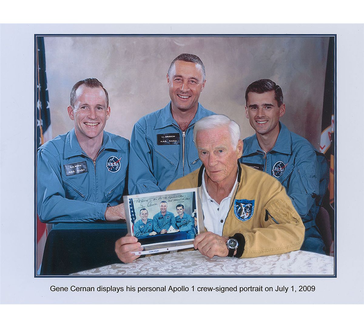 Extremely rare vintage official semi-glossy 10 x 8 ‘red-numbered’ NASA photo of the Apollo 1 crew posing in their blue flight suits with a model of their capsule, signed in black felt tip, “Ed White,” “Gus Grissom,” and “Roger Chaffee.” Photo is also signed across the top in black felt tip, “Presented to me by the Apollo 1 crew—Gene Cernan, ‘Last Man on the Moon.’” Reverse of photo also bears a Eugene Cernan Space Collection stamp. A couple light bends and surface marks, and scattered mild vertical streaking to finish, otherwise fine condition. Accompanied by a custom-made photo of Cernan holding the photo. Only a very small number of these crew-signed portraits are known to exist, with this particular example exhibiting a fantastic personal connection between the first and last Apollo lunar missions.