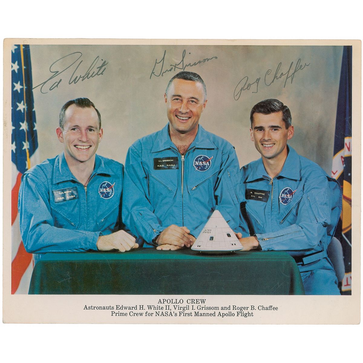 Very rare official color 10 x 8 NASA lithograph of the Apollo 1 crew posing in their blue flight suits with a model of their capsule, signed in black felt tip, “Ed White,” “Gus Grissom,” and “Rog[er] Chaffee.” In fine condition, with a couple of trivial creases near top edge. A handsome example of the scarcest of all the Apollo crew-signed portraits.