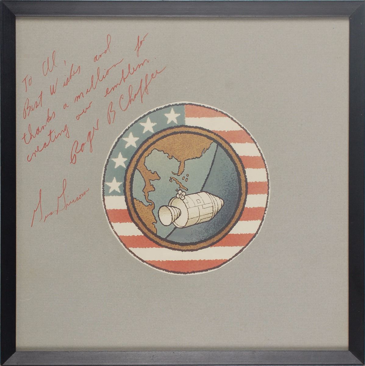 Rare original hand-painted artwork of a version of the Apollo 1 mission patch, accomplished by designer Al Stevens in watercolor on an off-white circular sheet, 6? diameter, affixed to an 11.5 x 11.5 mount, signed and inscribed on the mount in red ink to Stevens, “To Al, Best wishes and thanks a million for creating our emblem, Roger B. Chaffee” and “Gus Grissom.” Framed to an overall size of 12.75 x 12.75. In fine condition. From the family of Al Stevens. Stevens did the final design artwork for Apollo 1, 7, 9, and 10, and made design proposals for Apollo 11, 12, and 17. Apollo 1 is the least well-known of all Apollo emblems, and this example differs slightly from the final version which included the astronauts’ names and the mission within a thicker gold border. As a presentation to the designer personally inscribed by two of the scarce Apollo 1 astronauts, this is a one-of-a-kind and absolutely spectacular piece.