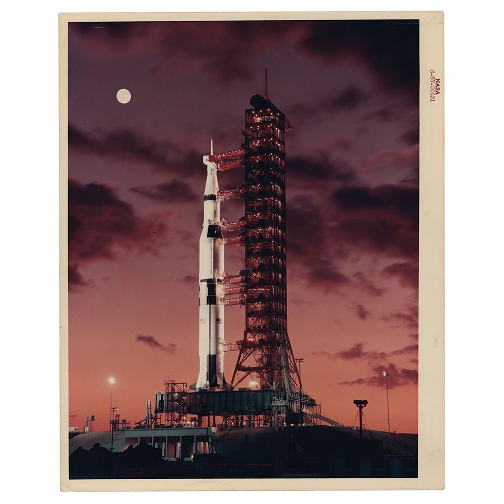 Dramatic official color glossy 8 x 10 red-numbered NASA photo (S-67-50531), showing an early morning view of the Apollo 4 Saturn V launch vehicle on Pad A at Launch Complex 39 prior to its launch on November 9, 1967. Reverse bears "A Kodak Paper" watermarks. In fine condition, with a few small surface creases.