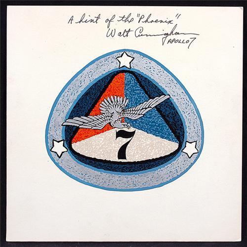 <Our item number 138386><B>Apollo 7, 1968, Interim Concept Al Stevens Crew Patch Painting.</B> (10x10") This mixed media original artwork on posterboard by artist Al Stevens is an intermediate design concept for the flight's crew patch. The artwork has been signed, after the fact, by lunar module pilot Walt Cunningham with his comments. The "Phoenix" was used in the design because the crew really wanted to name their Command Module "Phoenix" in honor of Apollo 1, and the concept that the flight symbolized NASA's rebirth. Stevens did the final design artwork for Apollo 1, 7, 9 and 10 and made design proposals for Apollo 11, 12 and 17. Unique, striking and quite important. <BR>Estimated Value $500 - 750. <BR><BR>Our item number 138386<BR><IMAGES><P ALIGN="CENTER"><IMG SRC="http://www.goldbergcoins.net/liveauction/49jpegs/138386.jpg"> </P></IMAGES>