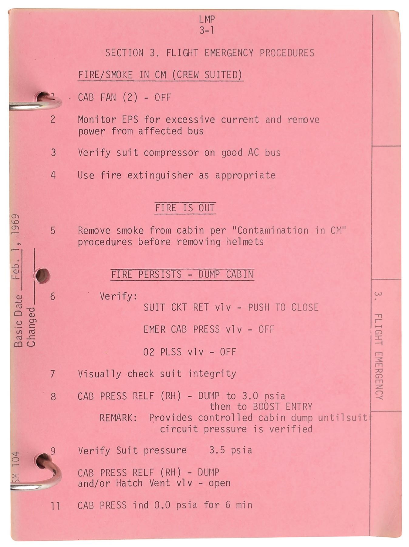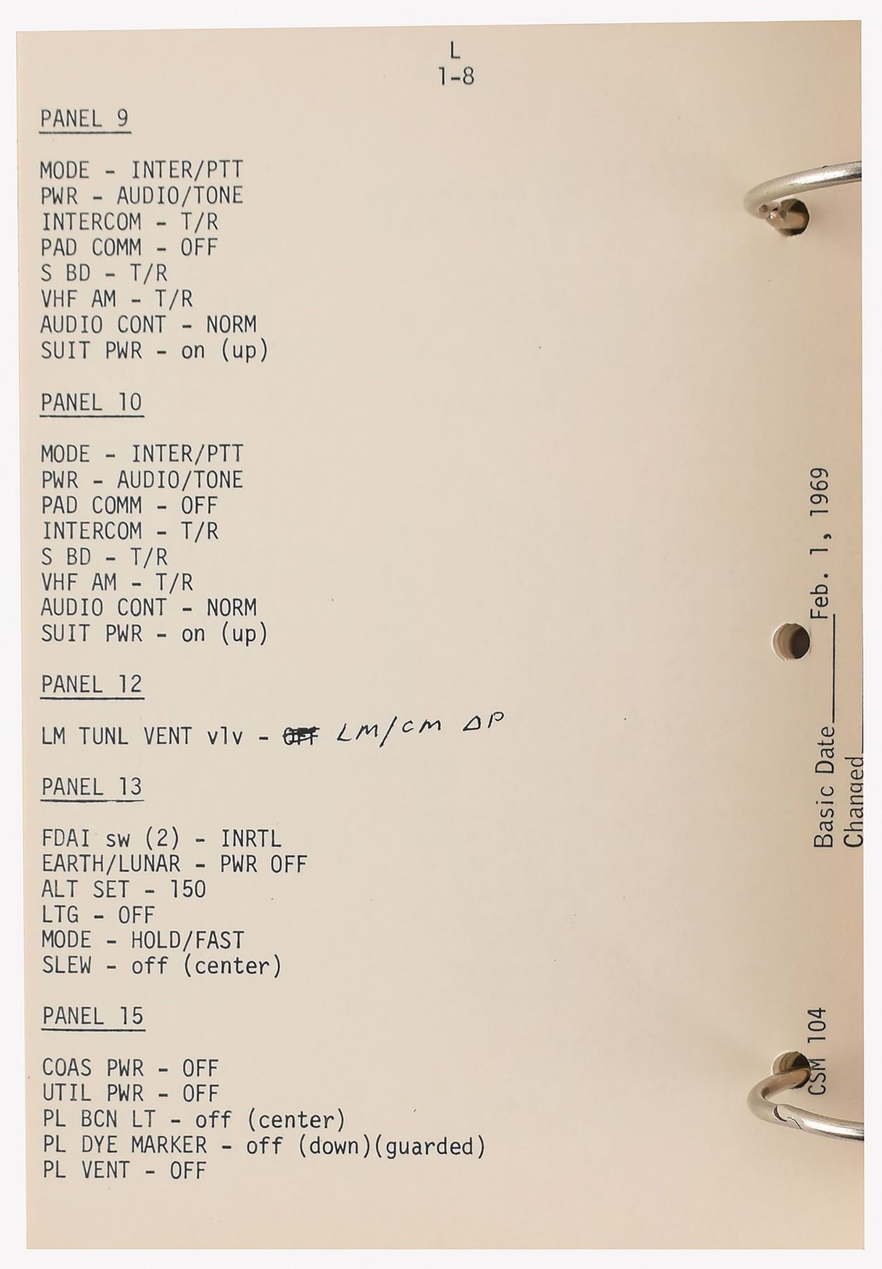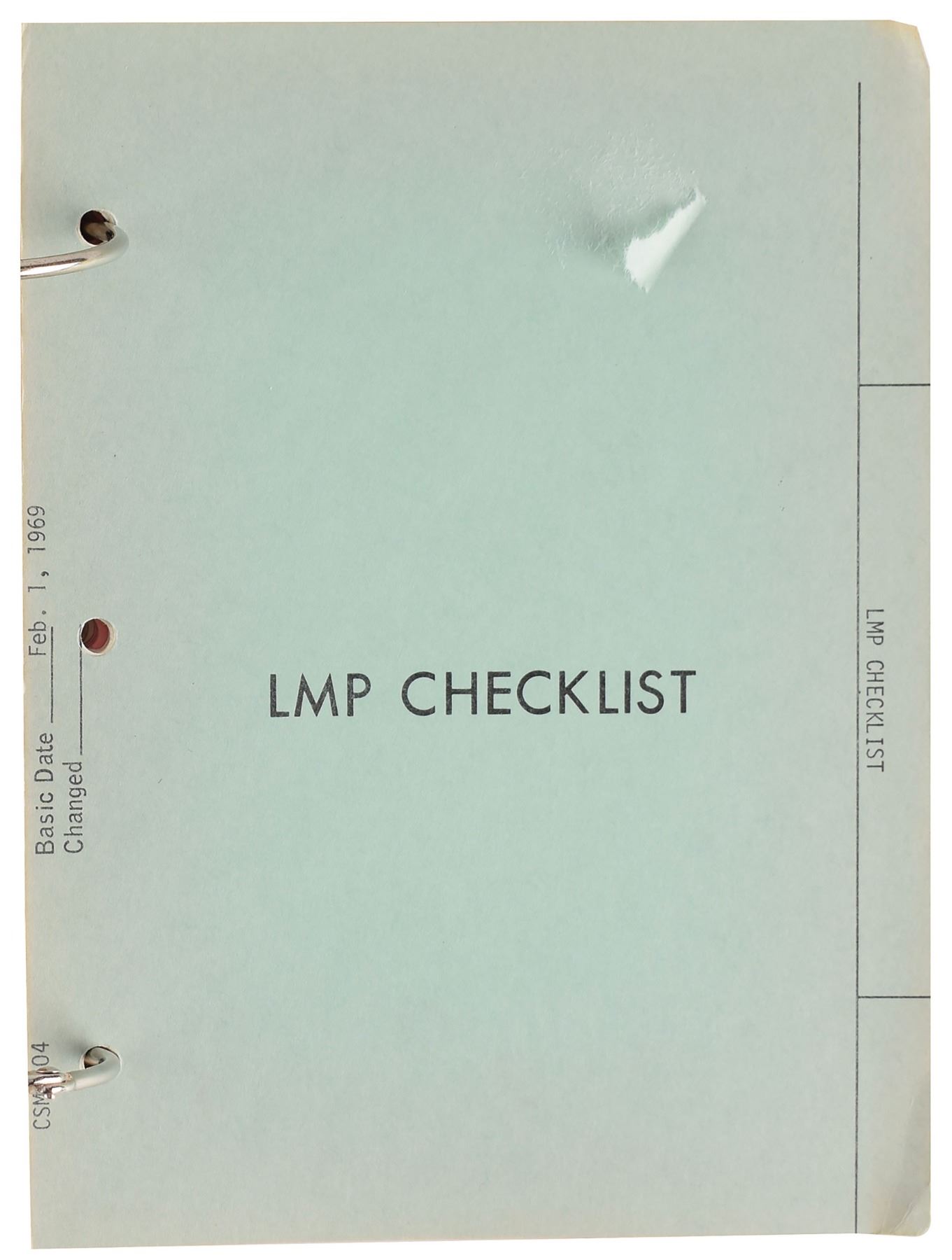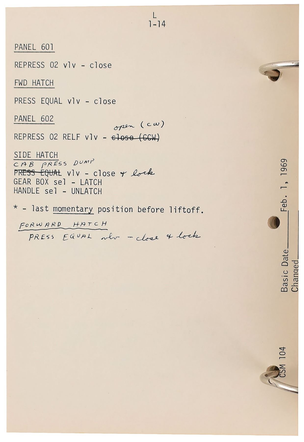Official ring-bound NASA checklist entitled "Apollo CSM 104, Flight Crew Abbreviated Checklist" used by Russell A. Larson of MIT's Instrumentation Laboratory, prepared by the Manned Spacecraft Center's Spacecraft Systems Branch, 6 x 8, February 1, 1969, marked on the front cover in felt tip, "D'Flight, MIT/IL, Russ Larson." The abbreviated checklist is divided into sections for "Launch Operations," "CMP Checklist," "LMP Checklist," and "Entry Operations," each containing its own subsections. Several pages have been annotated with changes or additions to procedures and instructions. In fine condition, with light general wear from use. Russ Larson worked as a program engineer and astronaut liaison at MIT's Instrumentation Lab, where he was involved in programming the Lunar Module's Apollo Guidance Computer; he worked directly with the astronaut crews, training them on the simulators and guidance system.