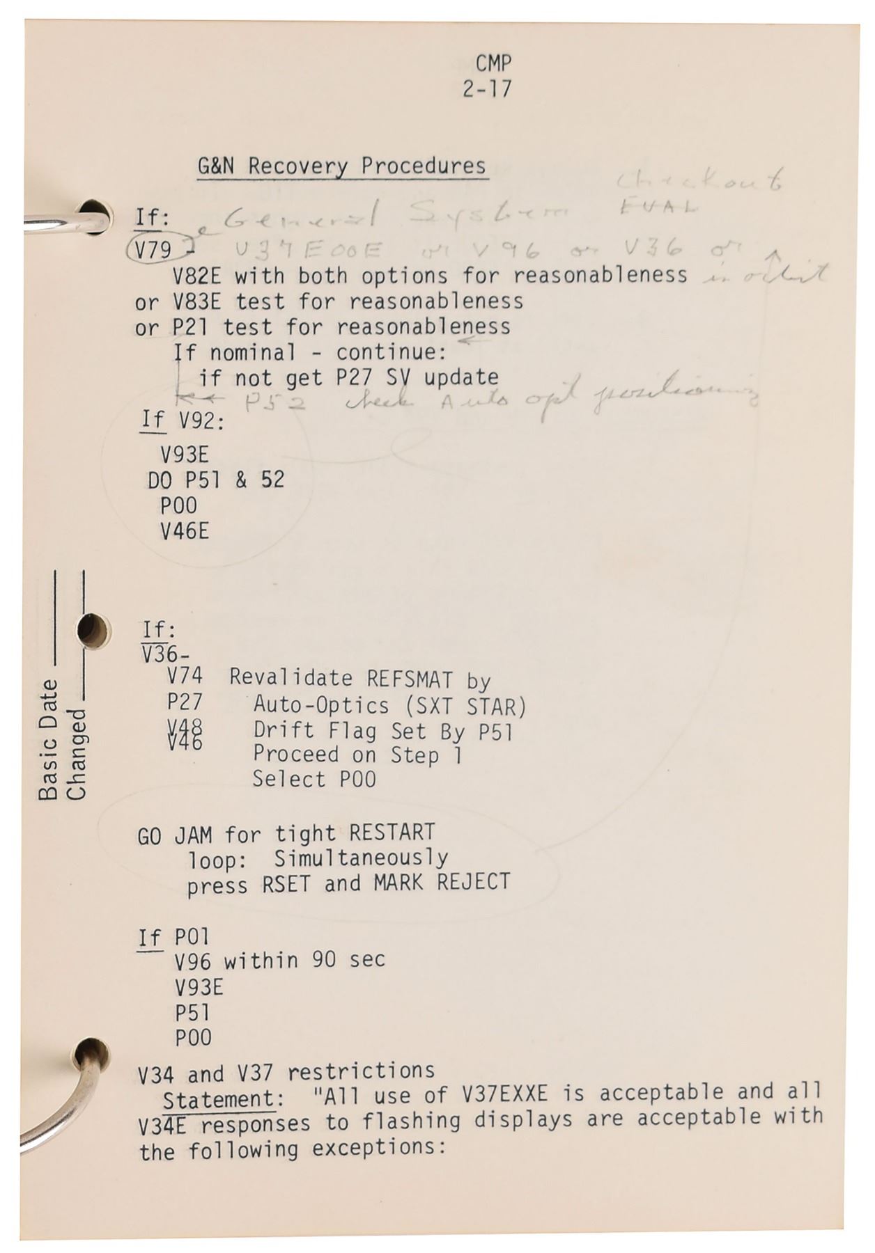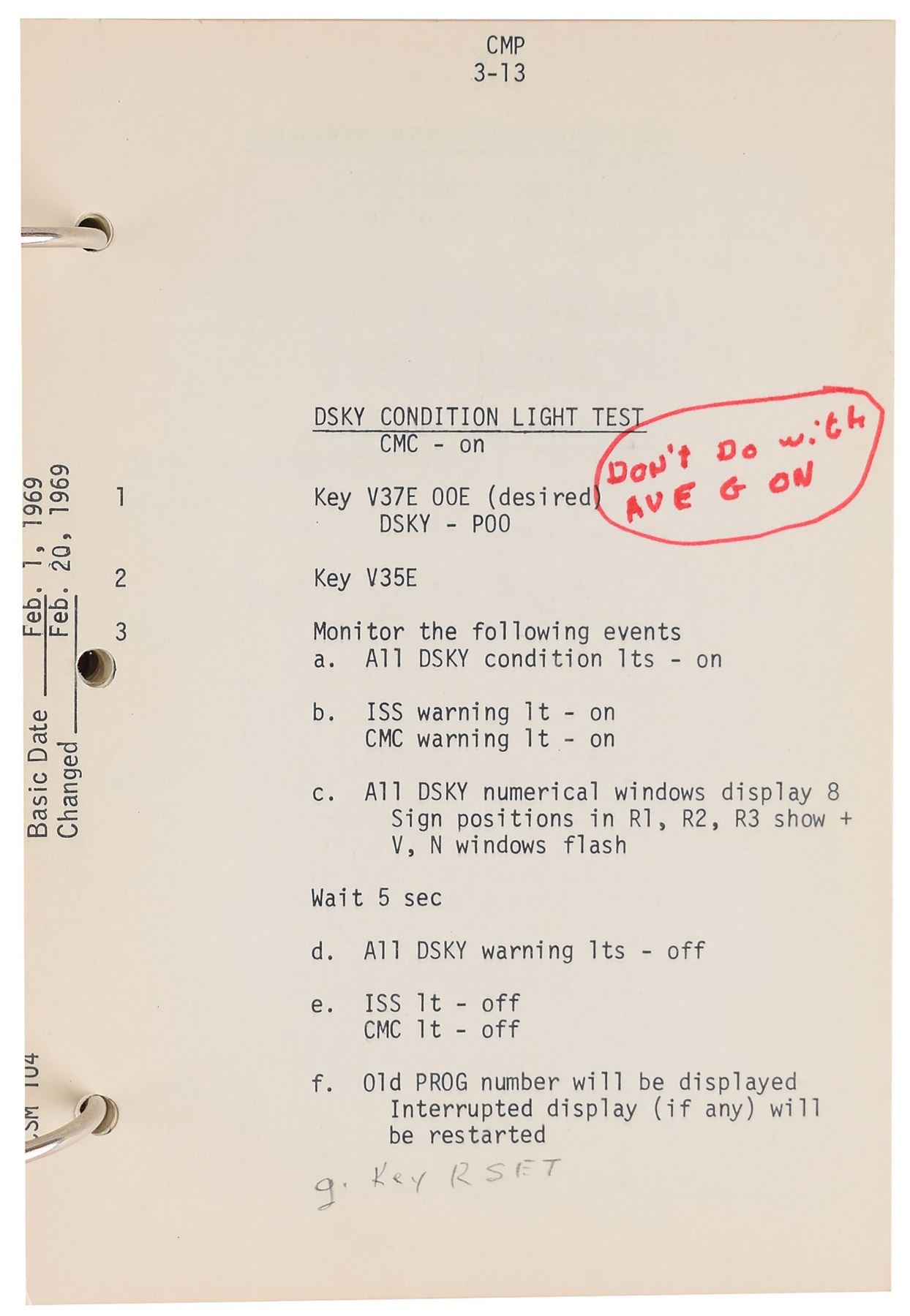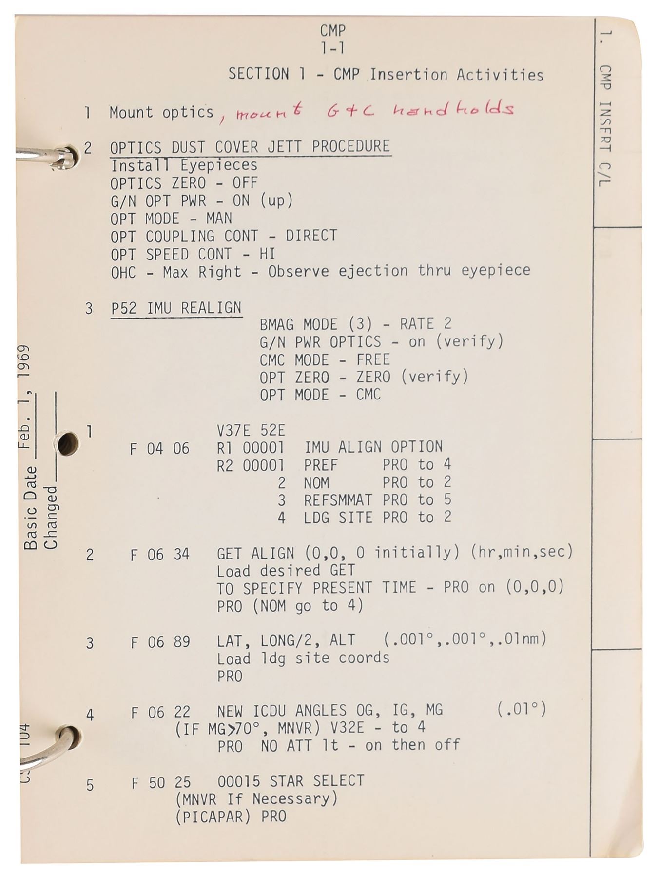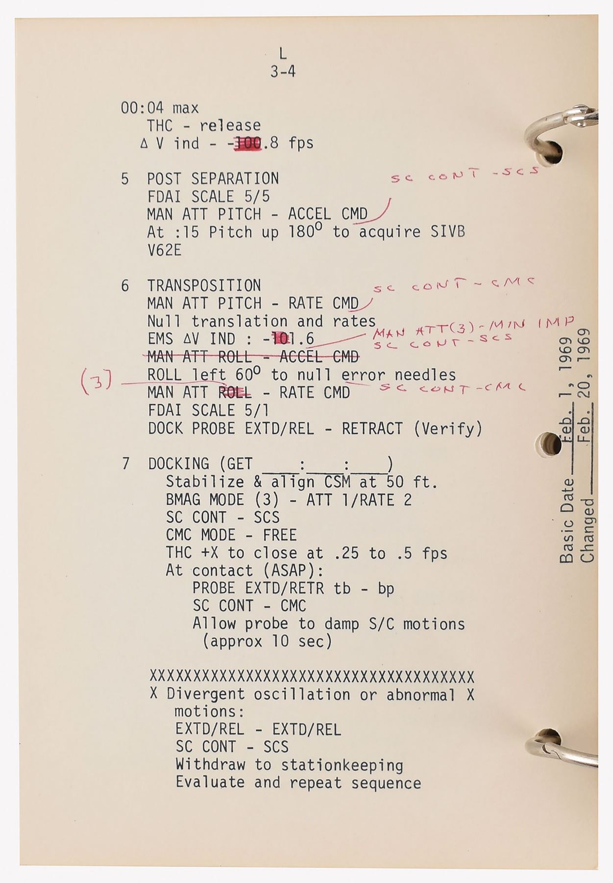 Official ring-bound NASA checklist entitled "Apollo CSM 104, Flight Crew Abbreviated Checklist" used by Russell A. Larson of MIT's Instrumentation Laboratory, prepared by the Manned Spacecraft Center's Spacecraft Systems Branch, 6 x 8, February 1, 1969, marked on the front cover in felt tip, "D'Flight, MIT/IL, Russ Larson." The abbreviated checklist is divided into sections for "Launch Operations," "CMP Checklist," "LMP Checklist," and "Entry Operations," each containing its own subsections. Several pages have been annotated with changes or additions to procedures and instructions. In fine condition, with light general wear from use. Russ Larson worked as a program engineer and astronaut liaison at MIT's Instrumentation Lab, where he was involved in programming the Lunar Module's Apollo Guidance Computer; he worked directly with the astronaut crews, training them on the simulators and guidance system.