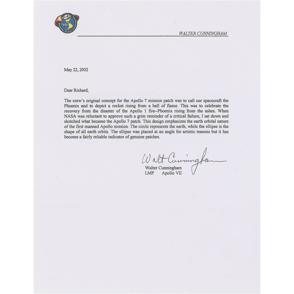 Original painting of the Apollo 7 mission logo done by Alan A. Stevens, closely cropped and affixed to an off-white 8.25 x 8 mount, signed in black felt tip on the mount, "This one expressed my concept. Needs one small change, Walt Cunningham, Apollo 7." In fine condition, with some light toning. Accompanied by a TLS signed by Cunningham, detailing how the Apollo 7 mission patch came to fruition. With input from each crew, Stevens designed unique mission logos to represent the missions of Apollo 1, 7, 9, and 10. In fine condition.