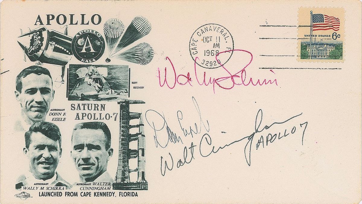 Apollo 7 launch day cover with a cachet honoring the mission, signed in ink, "Wally Schirra," "Donn Eisele," and "Walt Cunningham, Apollo 7." In fine condition, with tiny chip to extreme lower right corner tip. From the collection of aerospace memorabilia specialist Ken Havekotte. Pre-certified Zarelli Space Authentication.