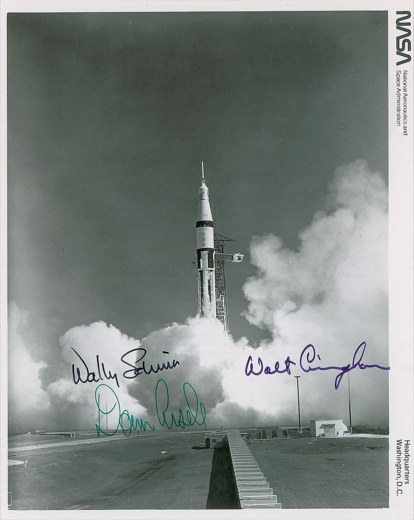 Dramatic official glossy 8 x 10 NASA photo of the Apollo 7 liftoff from Cape Canaveral, signed in black felt tip by Wally Schirra and Walt Cunningham, and in green felt tip by Donn Eisele. Reverse bears purple NASA caption text. In fine condition, with a couple of small surface creases.