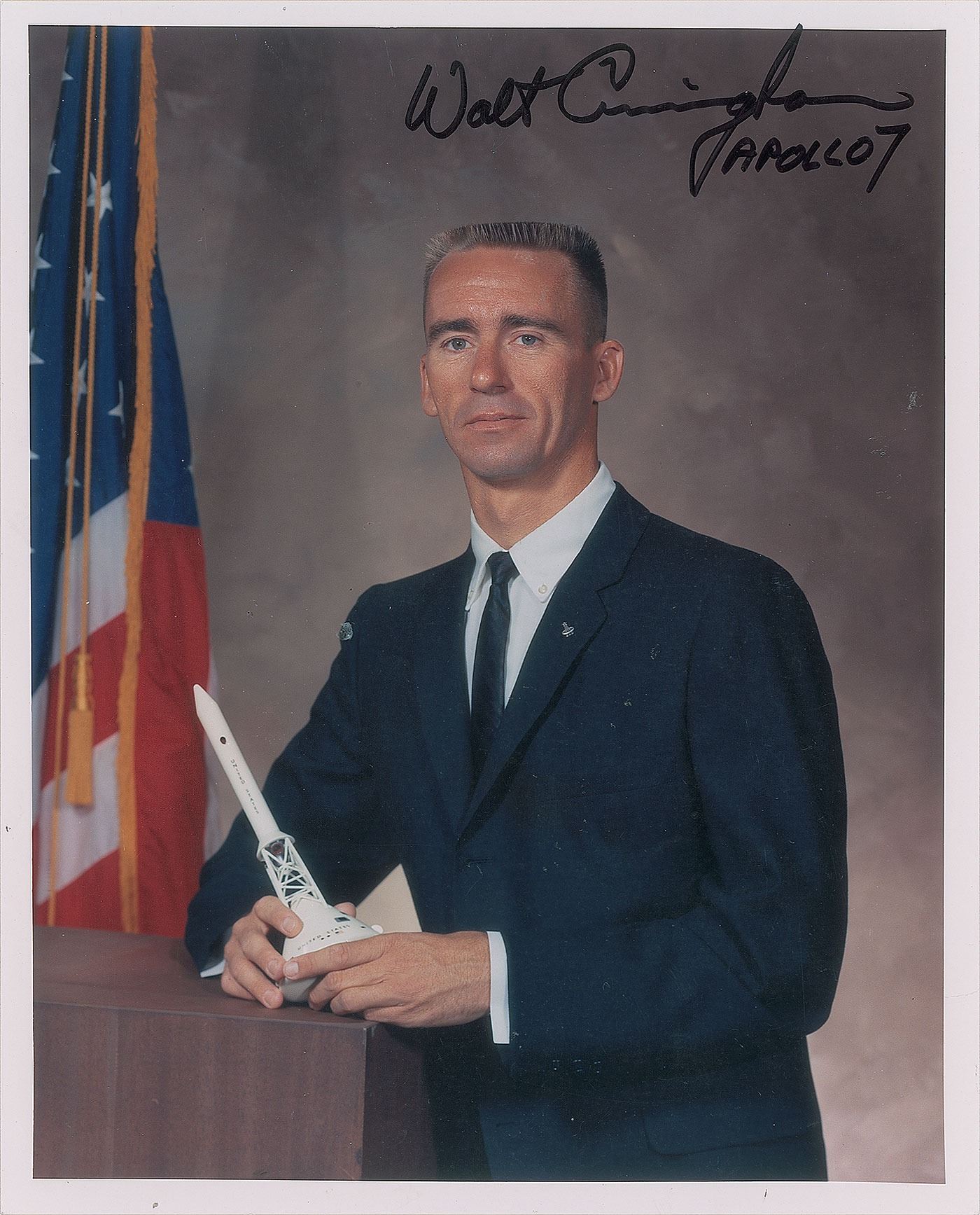Nice grouping of three 8 x 10 photos of the individual members of the Apollo 7 crew: a satin-finish 8 x 10 photo of Wally Schirra posing with his camera beside a Saturn V model, signed in black felt tip; an official NASA lithograph of Donn Eisele in a suit and tie, signed in black felt tip; and a satin-finish photo of Walt Cunningham posing with a model of the Command Module, signed in black felt tip. In overall fine condition, with a few light creases to Eisele and Cunningham.
