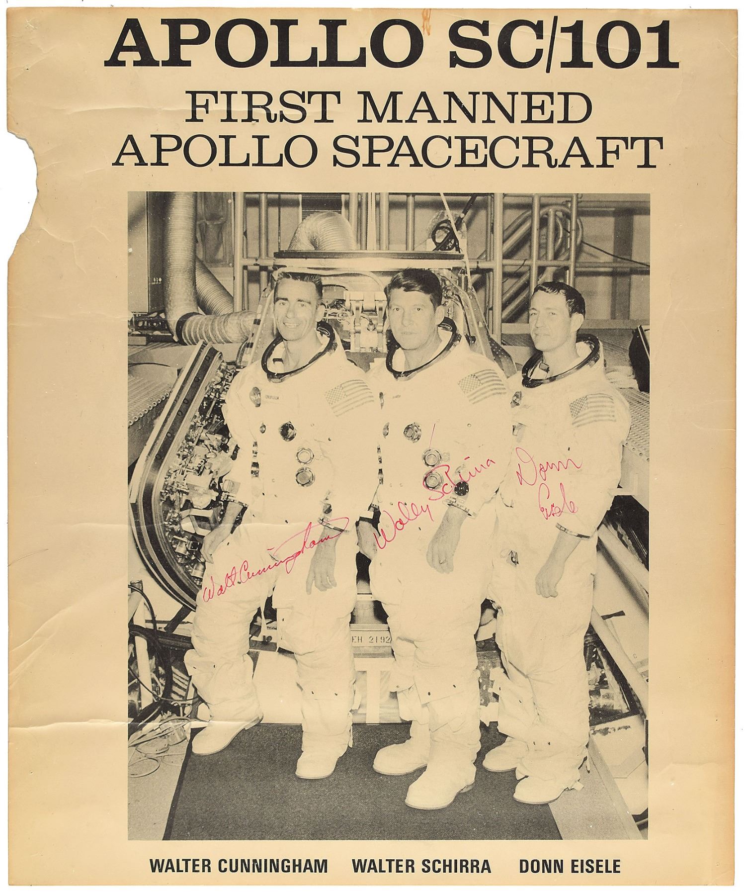 Uncommon early 17 x 20.5 NASA poster honoring the Apollo 7 mission, depicting the crew in their white space suits under bold text, "Apollo SC/101, First Manned Apollo Spacecraft," signed in red felt tip by Walt Cunningham, Wally Schirra, and Donn Eisele. In very good condition, with creasing, multiple horizontal folds, and loss to the upper left edge. From the personal collection of Paul Kruppenbacher, a member of the NASA Houston Landing and Recovery Division who trained Apollo astronauts in water recovery procedures and was deployed on U.S. Navy aircraft carriers for crew and spacecraft recovery operations.