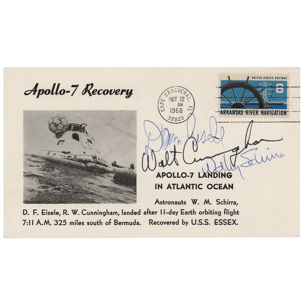 Recovery cover with a cachet honoring the Apollo 7 mission's splashdown in the Atlantic Ocean, postmarked at Cape Canaveral on the recovery date of October 22, 1968, signed in blue ballpoint by Donn Eisele and Wally Schirra, and in black felt tip by Walt Cunningham. In very fine condition.