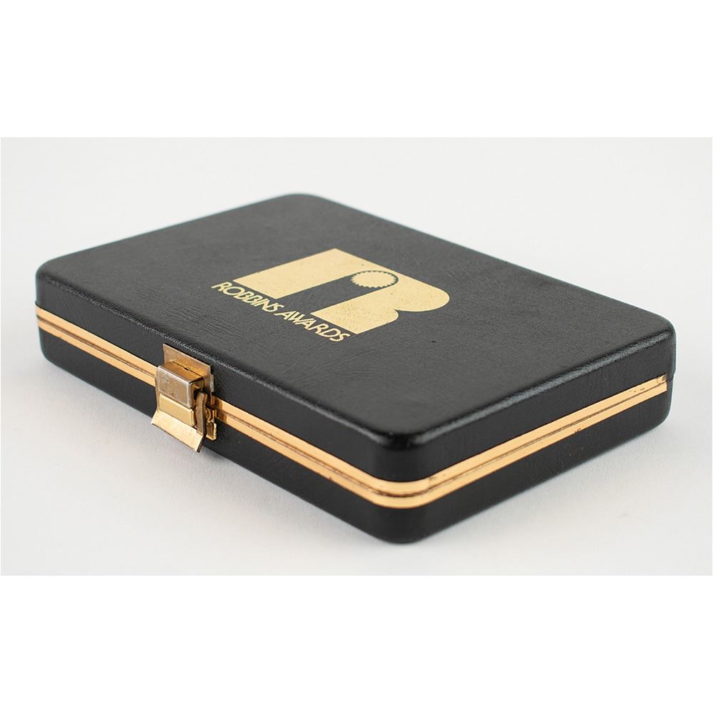 Unflown sterling silver Apollo 7 Robbins medal, possibly a prototype or salesman's sample, approximately 1‰Û_ in diameter, featuring a raised design of the mission insignia on the face. The reverse is engraved with the mission's dates, "Oct. 11-22, 1968," and stamped with the Robbins hallmark. Condition is mint state, with heavy tarnishing to reverse. Accompanied by a small plastic box and larger hinged "Robbins Awards" case, measuring 6‰Û_ x 4‰Û_ x 1‰Û_. From the collection of a former Robbins Company executive.