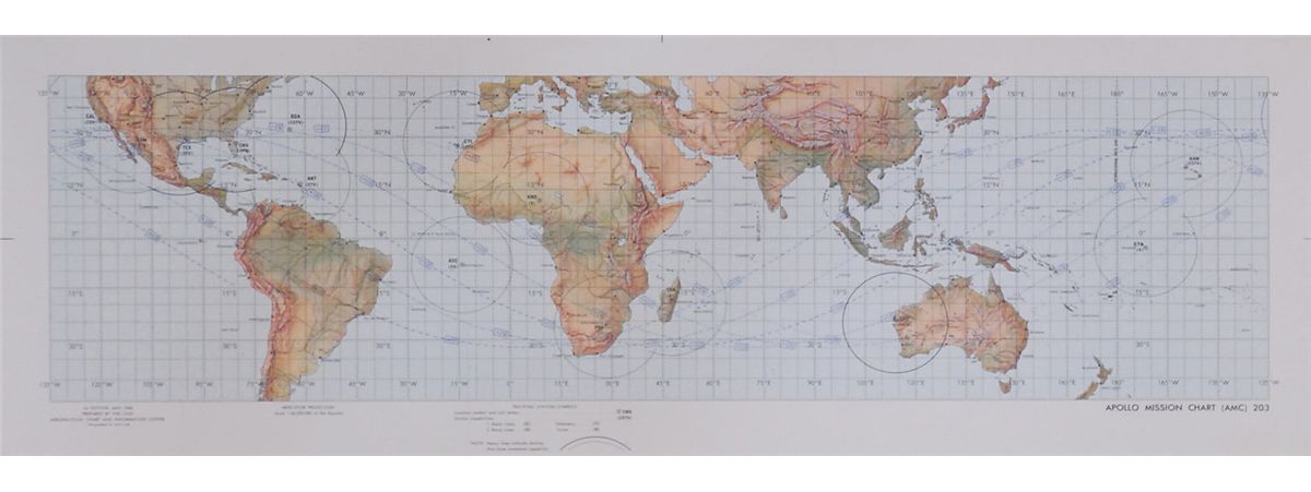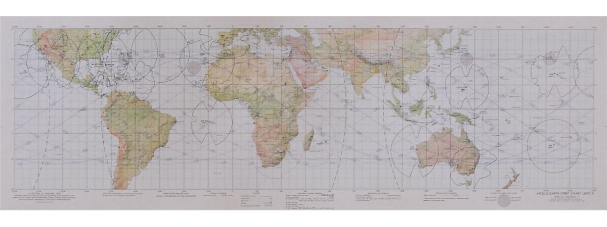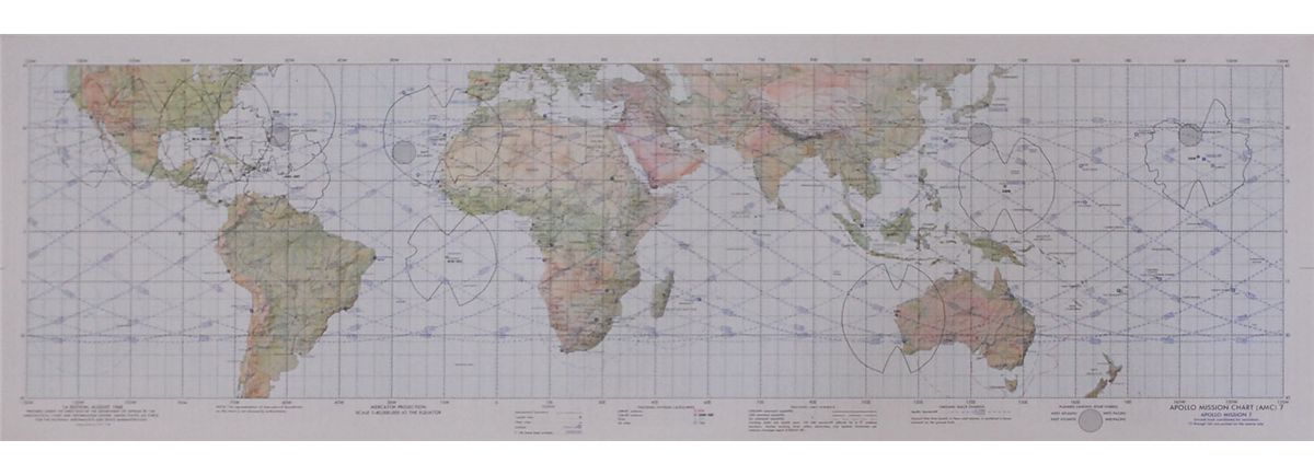 Three original first edition Apollo charts: an Apollo 9 Earth Orbit chart, an Apollo 7 mission chart, and a general mission chart labeled “Apollo Mission Chart (AMC) 203.”All three originate from the estate of a gentleman who retired as assistant director of The Aeronautical Charts and Information Center. In overall fine condition. Rolled.