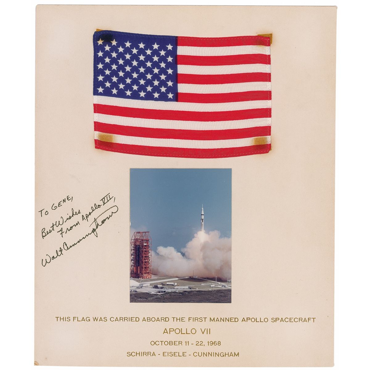 Flown printed fabric American flag, 6 x 4, flown aboard Apollo 7, the first manned Apollo mission. Flag is affixed by its corners to a 10 x 12 presentation mount, along with a color image of the mission’s launch, stating “This flag was carried aboard the first manned Apollo spacecraft Apollo VII. October 11–22, 1968. Schirra-Eisele-Cunningham.” Mount is signed and inscribed in black ink, “To Gene, Best wishes from Apollo VII, Walt Cunningham.” In fine condition, with small squares of toning to each corner of flag from adhesive on reverse.