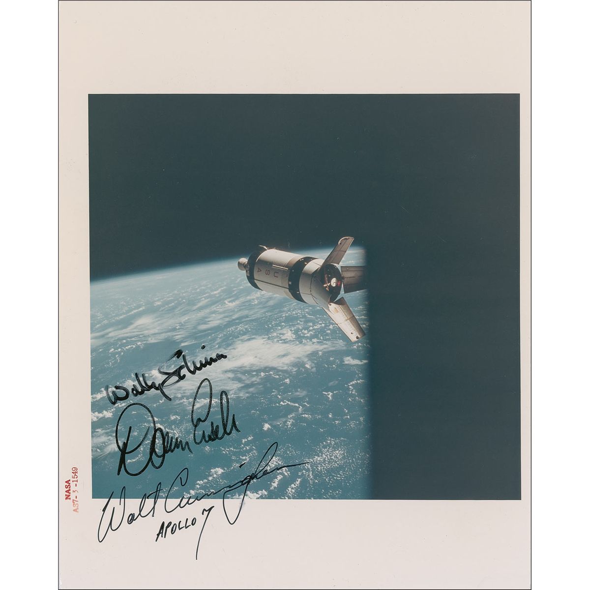 Attractive color glossy 8 x 10 ‘red-numbered’ NASA photo of the command/service module in orbit, signed in black felt tip, “Wally Schirra,” “Donn Eisele,” and “Walt Cunningham, Apollo 7.” In fine condition.
