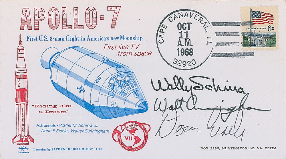 Commemorative cover with a cachet honoring the Apollo 7 mission, signed in black felt tip by Walt Cunningham and Donn Eisele, and also bearing an autopen signature of Wally Schirra. In fine condition.