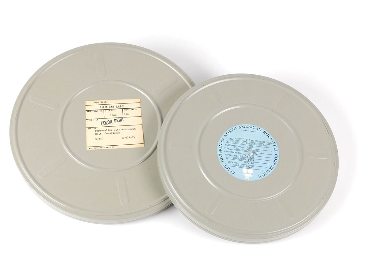 Two original canisters of 16mm color film from the Apollo 7 mission. First canister measures 9.5? in diameter, and contains one reel of sound film. Rockwell Corporation label affixed to the cover reads, in part: “Apollo 7 1st Manned Flt. & Return of Astro’s to DNY…December 1968.” Second canister measures 10.5? in diameter and contains one reel of film. MSC label affixed to the cover reads, “Personality Clip Astronaut Walt Cunningham.” In fine condition.