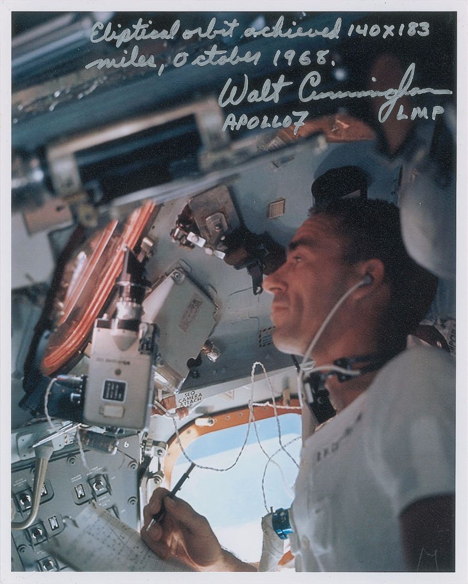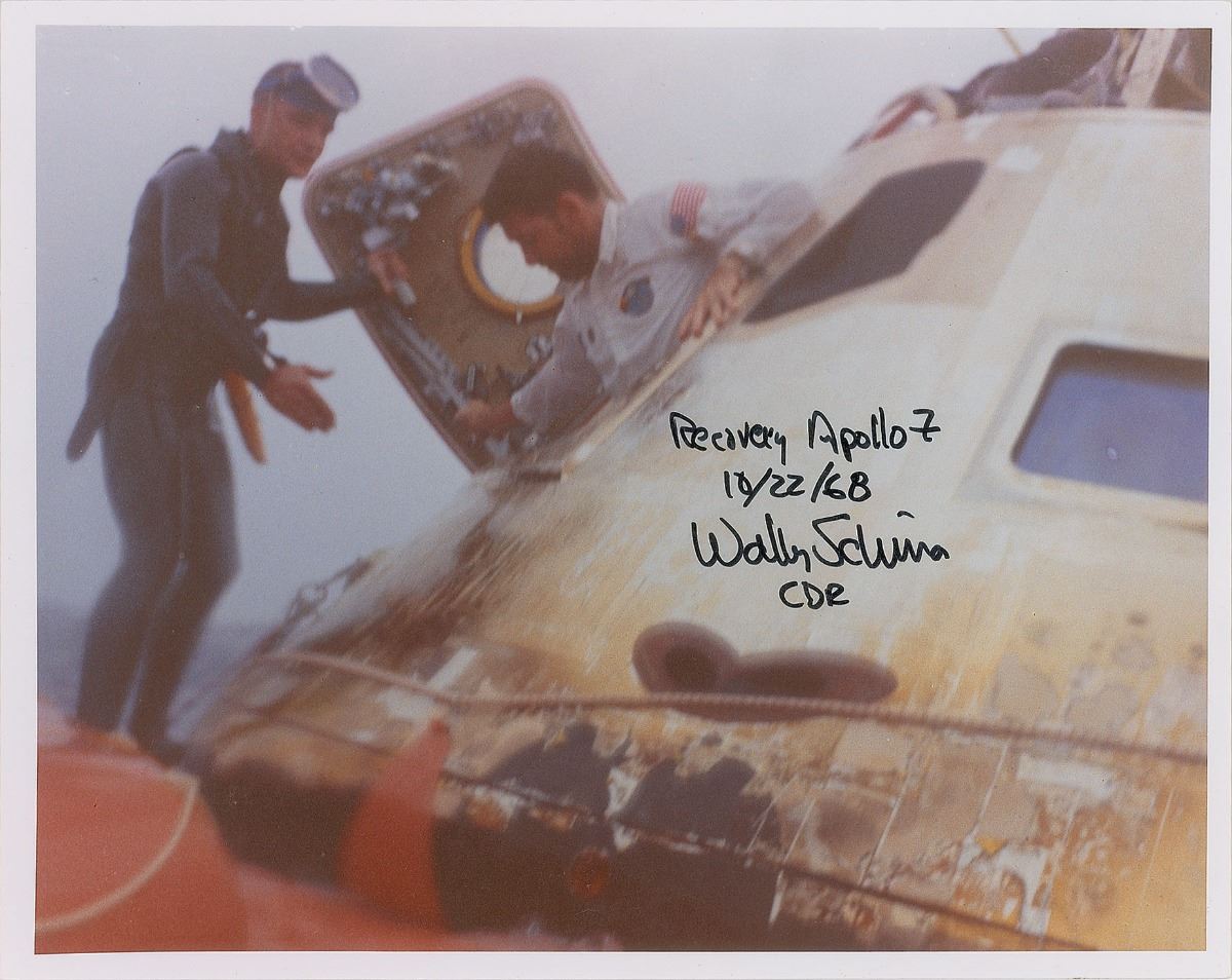 Three photos: a glossy 8 x 10 photo of the Apollo 7 crew, signed in blue felt tip by Wally Schirra and Walt Cunningham; a color satin-finish 10 x 8 photo of the recovery, signed in black felt tip, “Recovery Apollo 7, 10/22/68, Wally Schirra CDR”; and a color satin-finish 8 x 10 photo of Cunningham in the spacecraft, signed in silver ink, “Elliptical orbit achieved 140 x 183 miles, October 1968. Walt Cunningham, Apollo 7 LMP.” In overall fine condition.