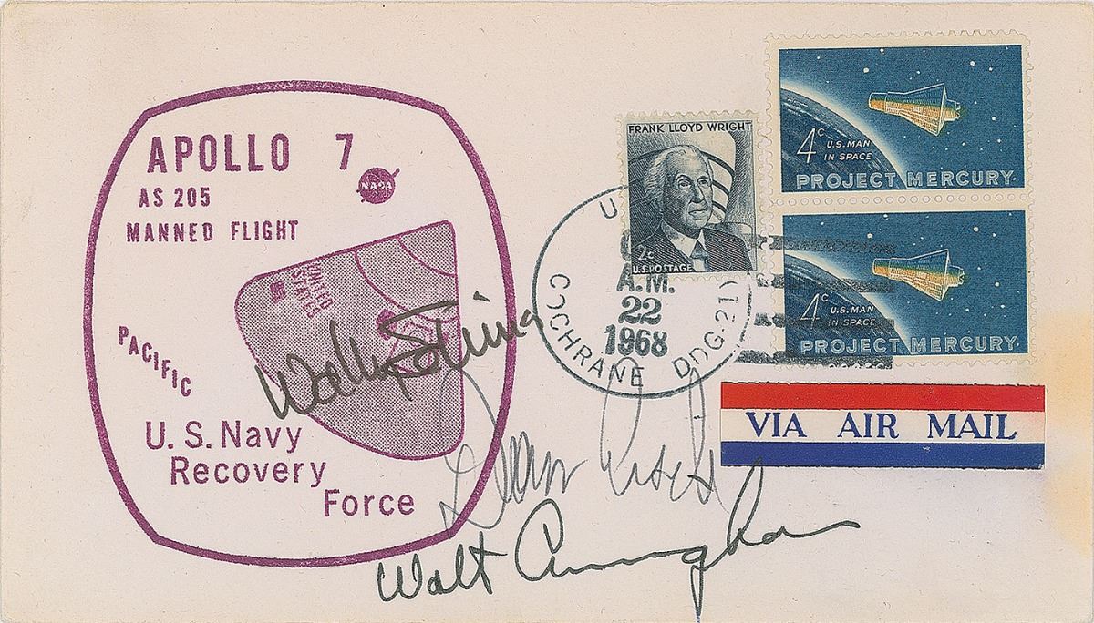 Splashdown cover with a stamped cachet honoring Apollo 7 and the Pacific U.S. Navy Recovery Force, postmarked October 22, 1968, signed in black ink or felt tip by Wally Schirra, Donn Eisele, and Walt Cunningham. In fine condition.