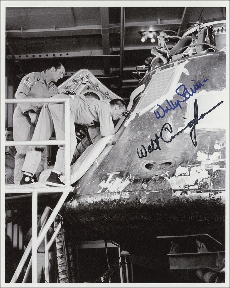 Satin-finish 8 x 10 photo of the Apollo 7 crew members examining their capsule after splashdown, signed in blue felt tip by Wally Schirra and in black felt tip by Walt Cunningham. An unusual pose in very fine condition.