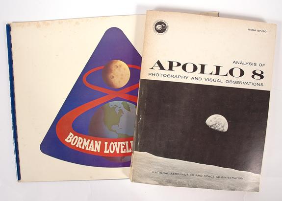 Apollo 8, 1968, Photos & Literature. Lot of three different including NASA publication "Analysis of Apollo 8, Photography and Visual Observations (NASA SP-201, complete with NASA lunar photo map in pocket at back); an original series of 35mm. commerial color slides (Series A-H, J-N) as issued from NASA photos after the flight (x4 photos per Series) and a large (14x11") spiral-bound booklet containing six different large photos relating to Apollo 8. All show minor foxing due to storage in the Houston humidity, but all exhibit the excitement caused the the flight of Apollo 8 - the first flight by a human out of the earth's atmosphere and the first to reach the vicinity of the moon.