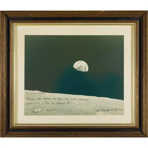 <B>Apollo 8 "Earthrise" Large Color Photo Signed</B></I> by the astronaut who took this landmark image "<I>Bill Anders</B></I>" and inscribed and signed by the fellow astronaut who took the first, lesser-known B&W photo of the same scene, "<I>To Nig Coons/ Thanks for helping to make this shot possible/ From the crew of Apollo 8- Frank Borman</B></I>". ("Nig" was an affectionate nickname for Dr. Coons.) Apollo 8 was an important mission in the U.S. race to the moon. It was the first manned launch using the powerful Saturn V rocket and Lovell, Borman, and Anders were the first to leave earth orbit, the first to orbit the moon, and therefore the first humans to see its "dark side." They were also the first to take photos of earth from deep space. Interestingly, the original photo was shot as Anders saw it, rotated 90° so that the earth was to the left instead of at the top. The rising Earth is depicted about five degrees above the lunar horizon in the photo taken on December 24, 1968 near 110 degrees east longitude. It was a photo that was immediately embraced by humanity and is certainly one of the most important photos ever taken. The image (sight size) is 19.75" x 16", matted to 23.5" x 19.5", and framed to 29" x 25". Fine condition. <I>From the estate of Dr. D. Owen Coons, Chief of NASA's Manned Spacecraft Center Medical Office.</B></I><BR><BR><b>Shipping:</b> Framed - with Glass, Large (<a target="_blank" href="http://www.heritageauctions.com/common/shipping.php">view shipping information</a>)