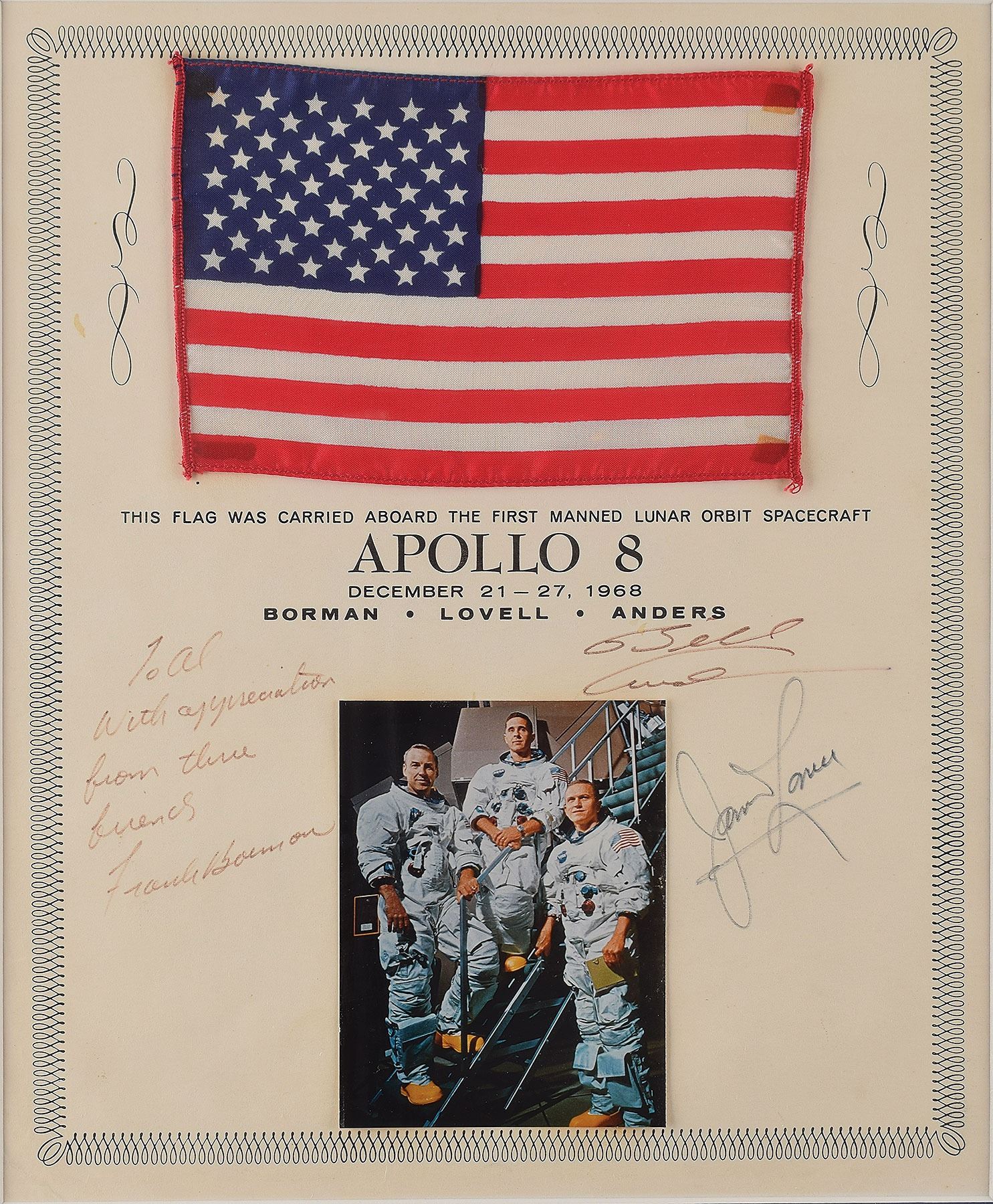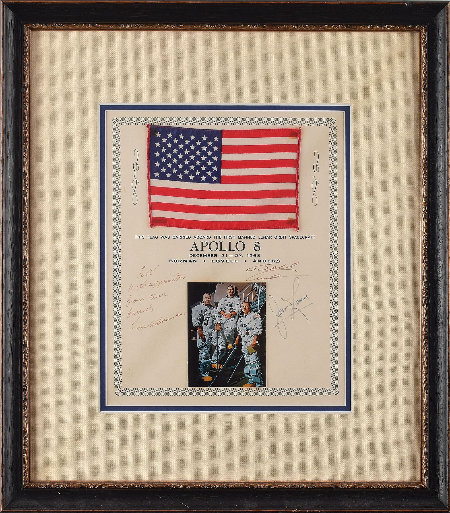 Flown fabric American flag carried into lunar orbit during the Apollo 8 mission. The flag, 6 x 4, is affixed to a 9.5 x 11.5 presentation sheet with printed text, "This flag was carried aboard the first manned lunar orbit spacecraft, Apollo 8, December 21–27, 1968," which is signed and inscribed below in black felt tip, “To Al, with appreciation from three friends, Frank Borman,” “Bill Anders,” and “James Lovell.” Archivally framed with UV-resistant glass and acid-free matting to an overall size of 18 x 20. In fine condition, with light toning to each corner of the flag from adhesive on the reverse. The recipient of the flag, Al Bishop, was an aerospace public relations specialist at NASA whose specially designed cachet of 'Bishop' insurance covers, printed specifically for the crew, their families and friends, have become prized collectables amongst the space and philatelic communities.