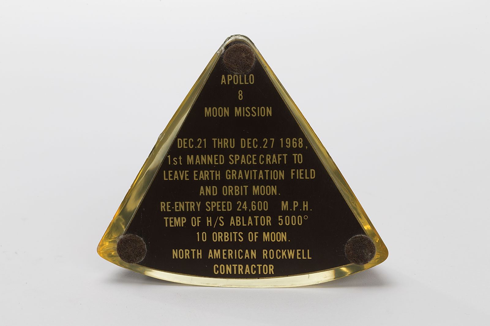 Flown heat shield ablator fragment removed from the Apollo 8 spacecraft, approximately measuring 2 x .25 x .5, encased in a capsule-shaped 3.75 x 3.25 x 1.75 piece of Lucite with reverse bearing a North American Rockwell label commemorating the second manned Apollo mission. In fine condition. From the personal collection of a former Apollo program engineer.