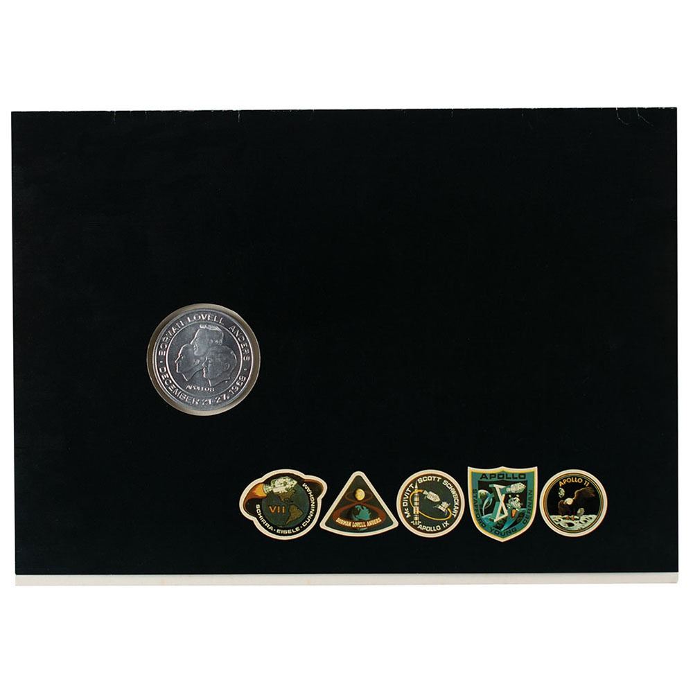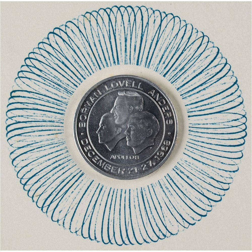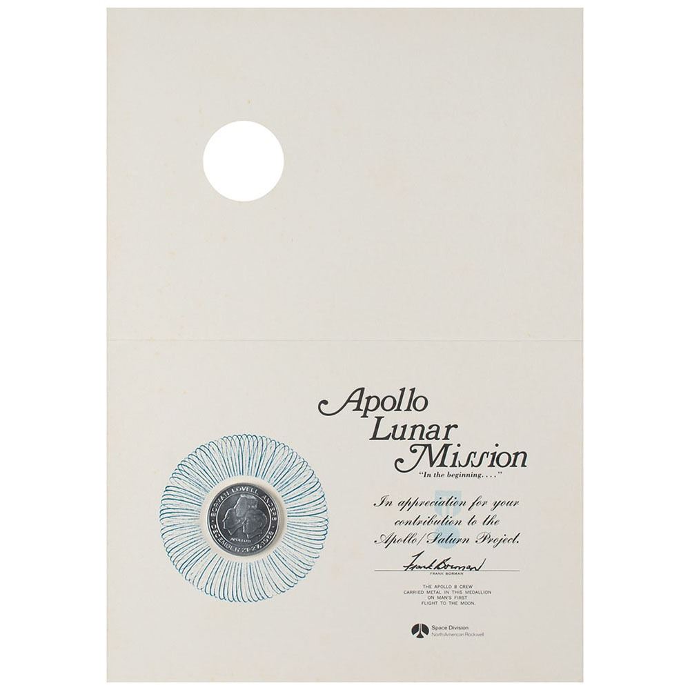 North American Rockwell presentation folder entitled ‰ÛÏApollo Lunar Mission,‰Û containing an Apollo 8 aluminum medallion, 1.5è diameter, which features profiles of the three-man crew and encircled raised text of their surnames and mission timeline. The medallion is affixed inside a 10 x 7.25 folder that affirms: ‰ÛÏThe Apollo 8 crew carried metal in this medallion on man‰Ûªs first flight to the Moon.‰Û The folder also features a facsimile signature of Frank Borman below printed text: ‰ÛÏIn appreciation for your contribution to the Apollo / Saturn Project.‰Û In fine condition, with faint spotting to inside.