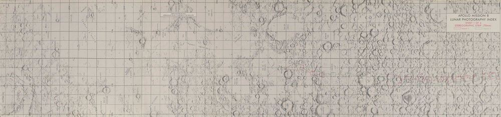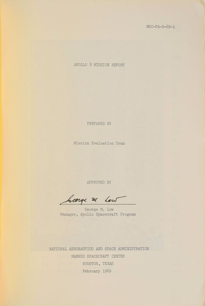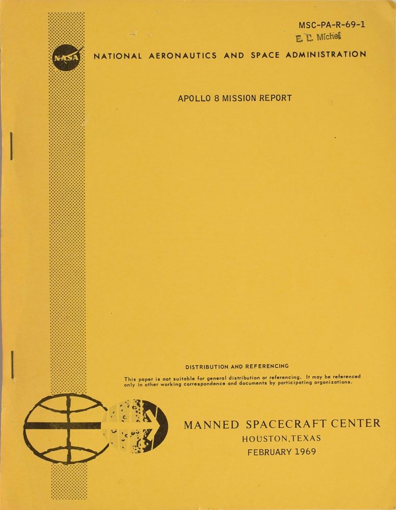Uncommon staple-bound manual entitled "Apollo 8 Mission Report," MSC-PA-R-69-1, 8 x 10.5, approximately 262 pages, February 1969. The report offers details about man's first mission to the moon, including information about the flight trajectory, photographic results, performance of the CSM, a biomedical evaluation, anomaly summary, and an overall assessment and conclusions. Most impressive are a set of four pull-out "Apollo Mission 8, Lunar Photography Index" charts bound into the manual, which each measuring 58 x 10.5 unfolded. The name "E. L. Michel," who worked in NASA's medical offices, is stamped in the upper right corner of the cover. In fine condition.