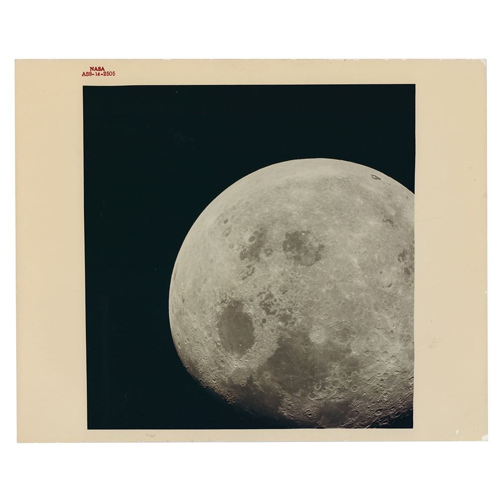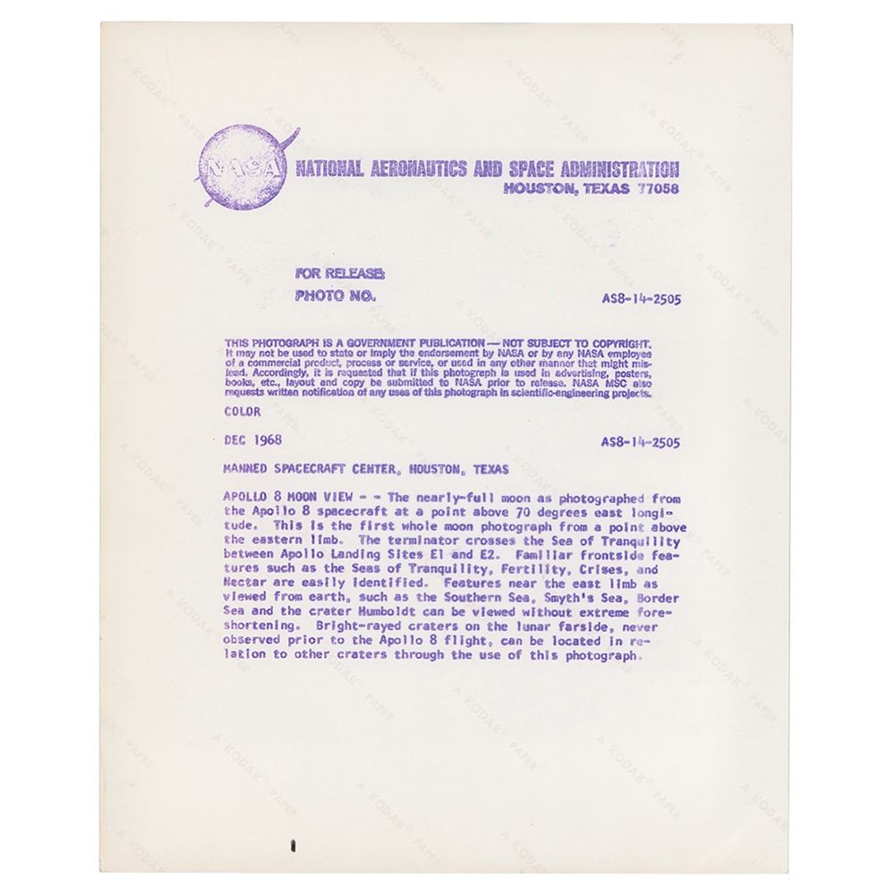Official color glossy 10 x 8 red-numbered NASA photo (AS8-14-2505), showing the nearly-full moon as photographed from the Apollo 8 spacecraft in December 1968. Reverse bears purple NASA caption text and "A Kodak Paper" watermarks. In fine condition, with creasing to the lower right corner of the border.