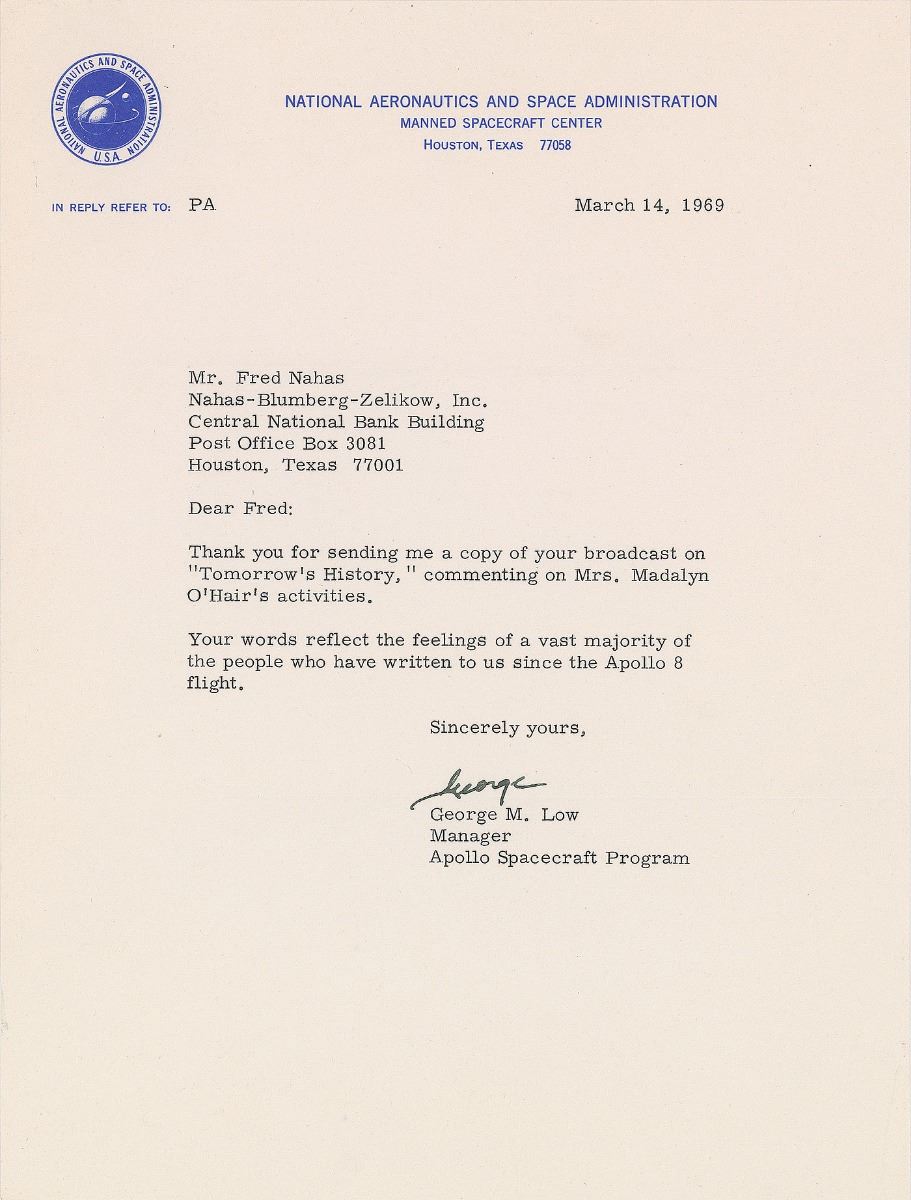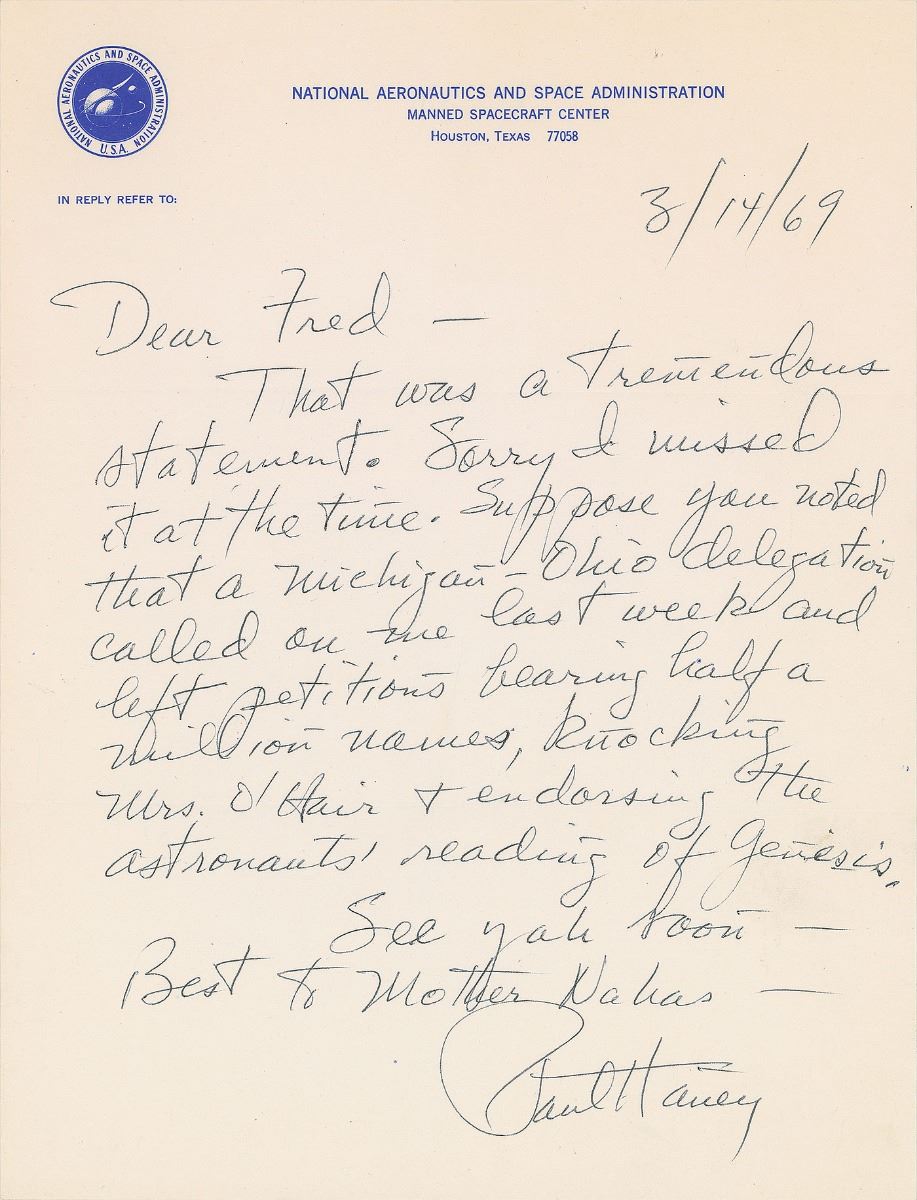 Two letters: an ALS signed by Paul Haney, and a TLS signed by George M. Low, both one page, 8 x 10.5, NASA letterhead, March 14, 1969. Both letters are addressed to Houston broadcaster Fred Nahas. The Haney letter, in full: “That was a tremendous statement. Sorry I missed it at the time. Suppose you noted that a Michigan–Ohio delegation called on me last week and left petitions bearing half a million names, knocking Mrs. O’Hair & endorsing the astronauts’ reading of genesis”; the Low letter, in full: “Thank you for sending me a copy of your broadcast on ‘Tomorrow’s History,’ commenting on Mrs. Madalyn O’Hair’s activities. Your words reflect the feelings of a vast majority of the people who have written to us since the Apollo 8 flight.” In overall fine condition. Prior to Apollo 8’s moon-orbiting recital of the first chapter of Genesis on December 24, 1968, outspoken atheist Madalyn Murray O'Hair collected some 28,000 signatures for a petition demanding that astronauts be prohibited from citing Scripture while on duty. Following the recital, O’Hair sued NASA and the US government alleging violations of the First Amendment, with the Supreme Court subsequently dismissing the suit due to lack of jurisdiction. A unique pairing of letters related to the separation of church and space.