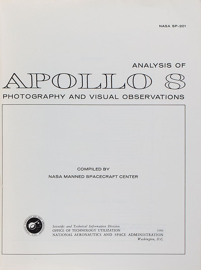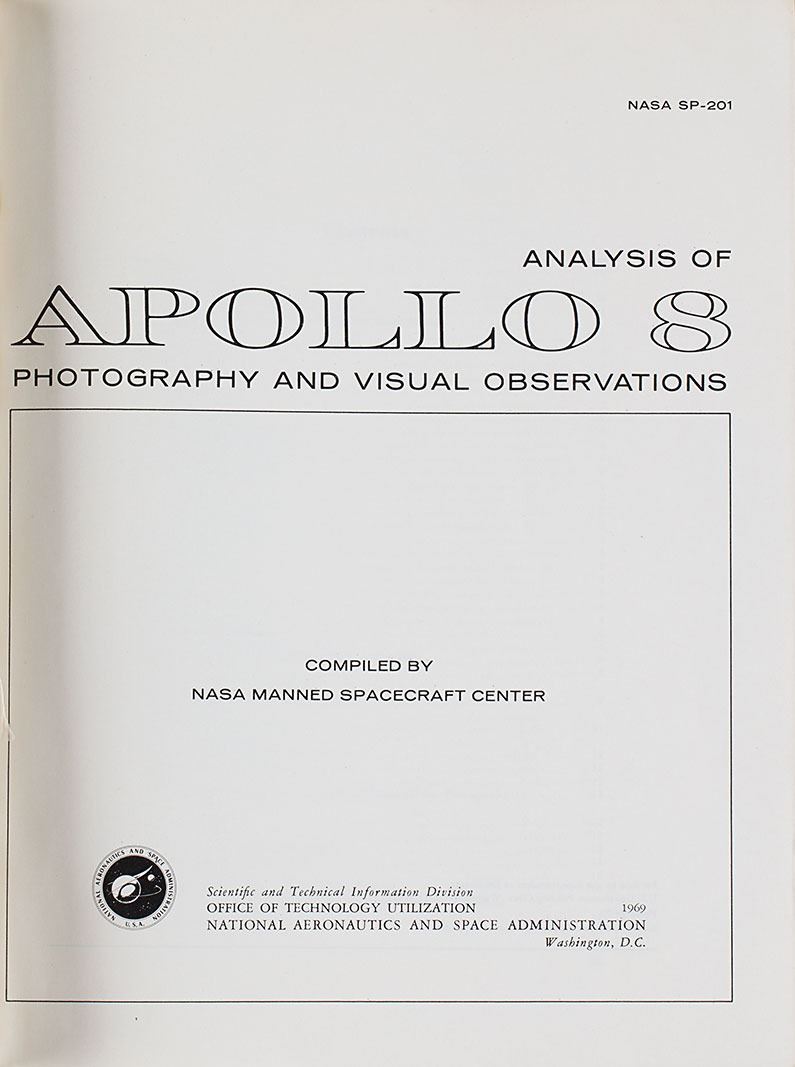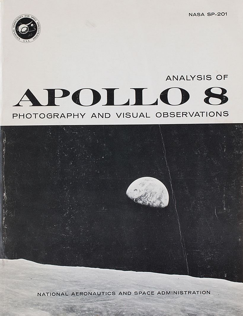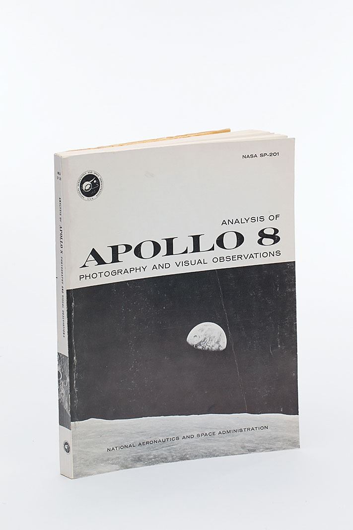 Official NASA publication entitled "Analysis of Apollo 8 Photography and Visual Observations" (NASA SP-201). Washington, DC: NASA, 1969. Softcover, 8.5 x 11, 337 pages. Following a detailed technical analysis of the mission's photography, the book reproduces the images captured during Apollo 8, including the iconic 'Earthrise' shot. A pocket in the rear contains four fold-out sheets of panoramic "Apollo Mission 8 Lunar Photography Index" charts. In very good to fine condition, with creasing to the covers from use. From the personal collection of a former Apollo program engineer.