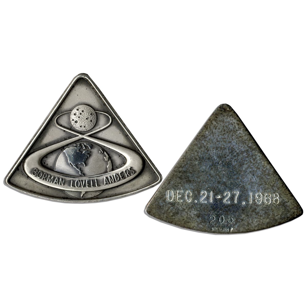Rare Apollo 8 Robbins Medal aboard the spacecraft during the 1968 mission. The historic Apollo 8 mission was the first human spaceflight to leave Earth's orbit. Pyramid- shaped sterling silver medal features mission insignia including the number 8 circling the moon and earth, and the last name of each crew member Frank Borman, James Lovell, and Bill Anders to front. Reverse is engraved ''Dec. 21-27, 1968'' with serial number ''205''. Medal measures 1.5'' x 1.25'' housed in its original ''Robbins Company'' plastic box with an ''205'' sticker on the bottom. Minor tarnishing to verso, else near fine. With an LOA from Apollo 13 astronaut Jack Swigert's sister.