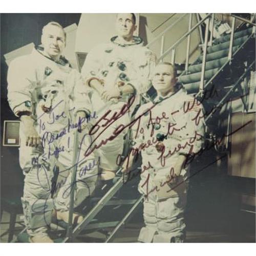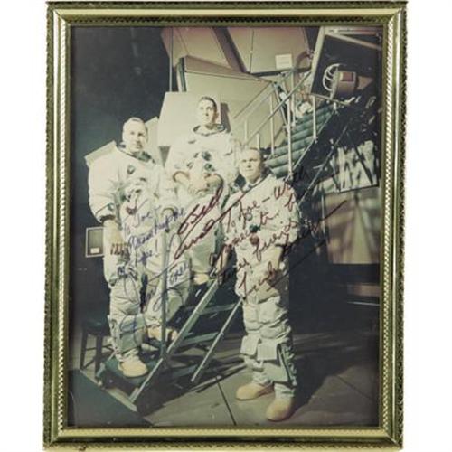 <B>Apollo 8 Signed Crew Color Photograph,</B></I> 7" x 9" (visible), framed to 8" x 10". Inscribed "<I>To Joe-/ Please keep me/ in shape!/ Jim Lovell,</B></I>" "<I>Bill Anders,</B></I>" and "<I>To Joe - With/ appreciation from/ three friends/ Frank Borman.</B></I>" Fine condition. <I>From the collection of renowned former physical trainer of the astronauts Joe Garino. This lot is accompanied by a signed certificate of authentication from Garino verifying its provenance.</B></I><BR><BR><b>Shipping:</b> Framed - with Glass, Small (<a target="_blank" href="http://www.heritageauctions.com/common/shipping.php">view shipping information</a>)