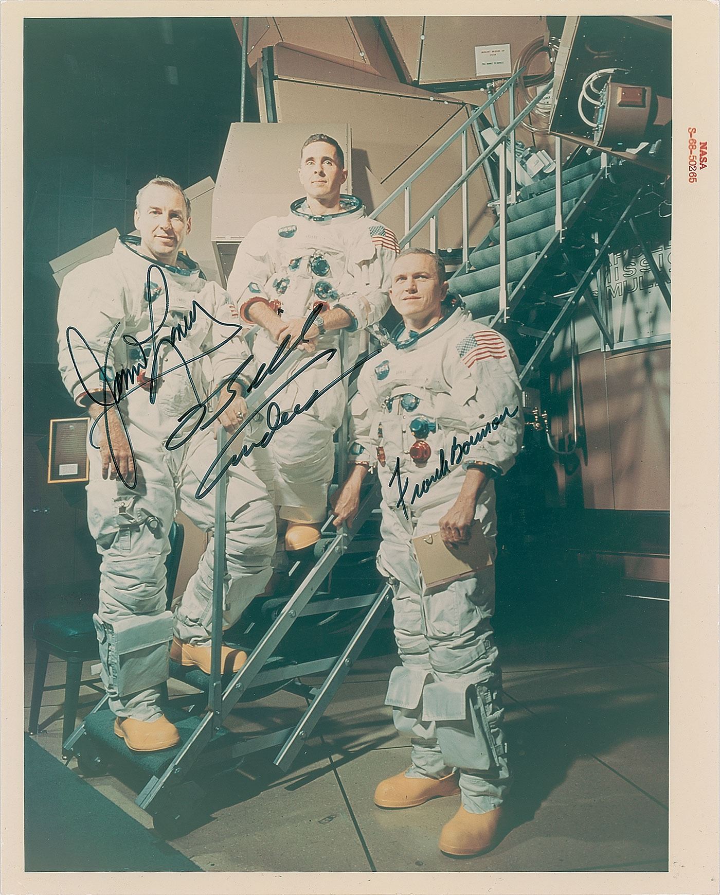 Superb official color 8 x 10 red-numbered NASA photo of the Apollo 8 crew, signed in black felt tip by James Lovell, Bill Anders, and Frank Borman. Reverse bears “A Kodak Paper” watermarks. In very good to fine condition, with light fingerprint marks to the background, small corner creases, and several paperclip impressions to the top edge.