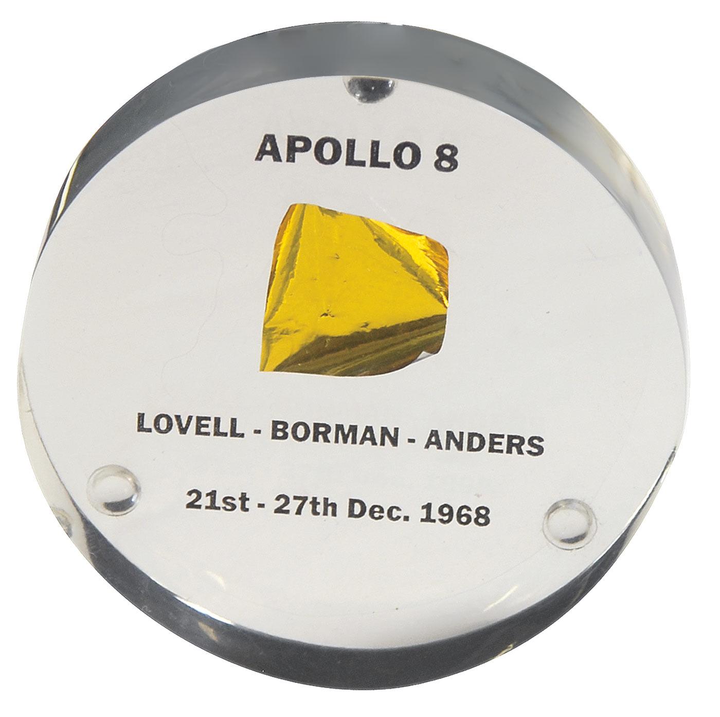 A .75 x .75 swatch of Kapton foil removed from the Apollo 8 command module after its return to Earth. Foil is encased in a 3” diameter Lucite disc imprinted with the crew names and mission date. An attractive flight-flown item from one of the most important Apollo missions, as Apollo 8 was the first human space flight to leave Earth orbit and orbit the moon.