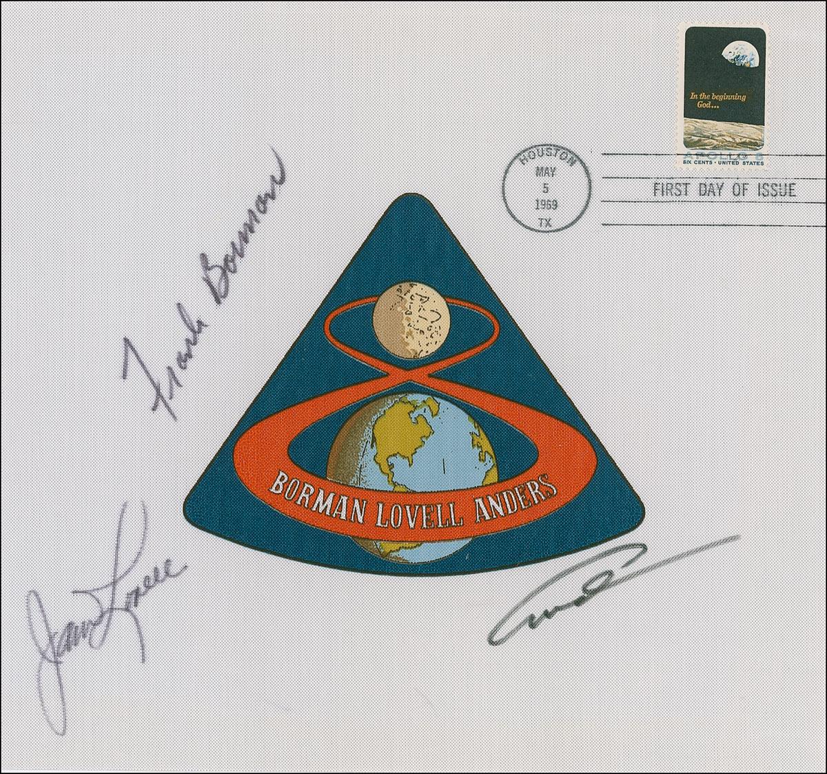 An 8.5 x 8.25 swatch of Beta cloth with a printed Apollo 8 mission emblem, signed in black felt tip by crew members Frank Borman and Bill Anders, and bears an autopen signature of James Lovell. Cloth also bears a “First Day of Issue” stamp, as well as an Apollo 8 commemorative postage stamp and a May 5, 1969, Houston, Texas, postmark. In fine condition. Great eye appeal and very desirable as Anders is the most difficult autograph to obtain of all living astronauts.