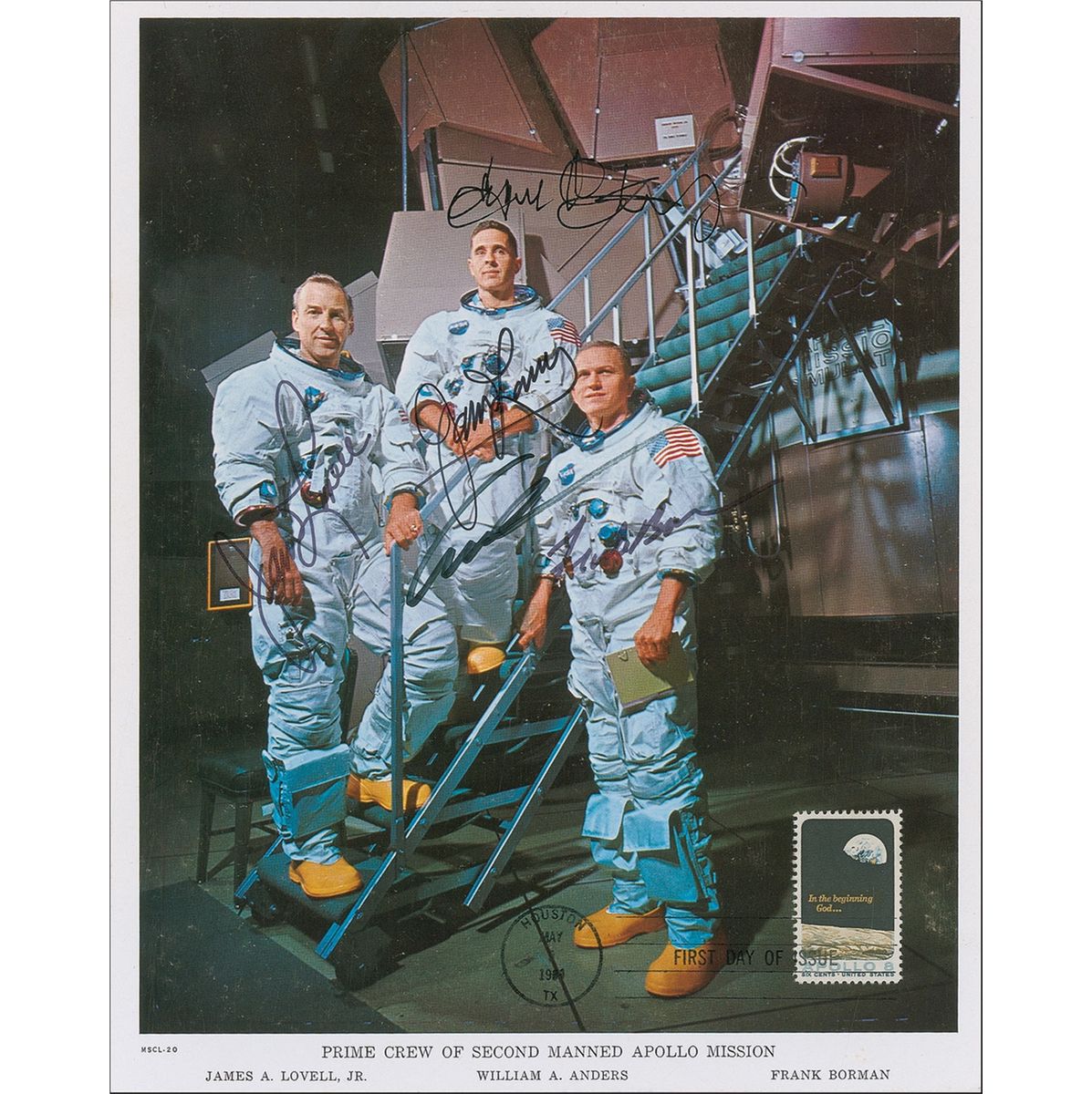 Color 8 x 10 NASA photo of the crew on the steps to the module with an affixed commemorative stamp and first-day cancellation at lower right, signed in black felt tip by James Lovell, William Anders (last name only), Frank Borman, and former NASA Flight Director Eugene Kranz. The photo also bears an autopen signature from Lovell. In fine condition, with some light surface marks and a trivial area of spotting to the bottom border. Accompanied by a lifetime certificate of authenticity from Scott Cornish.