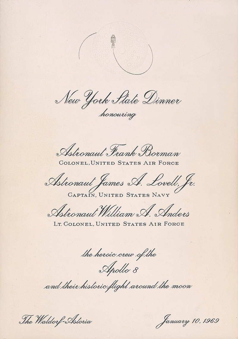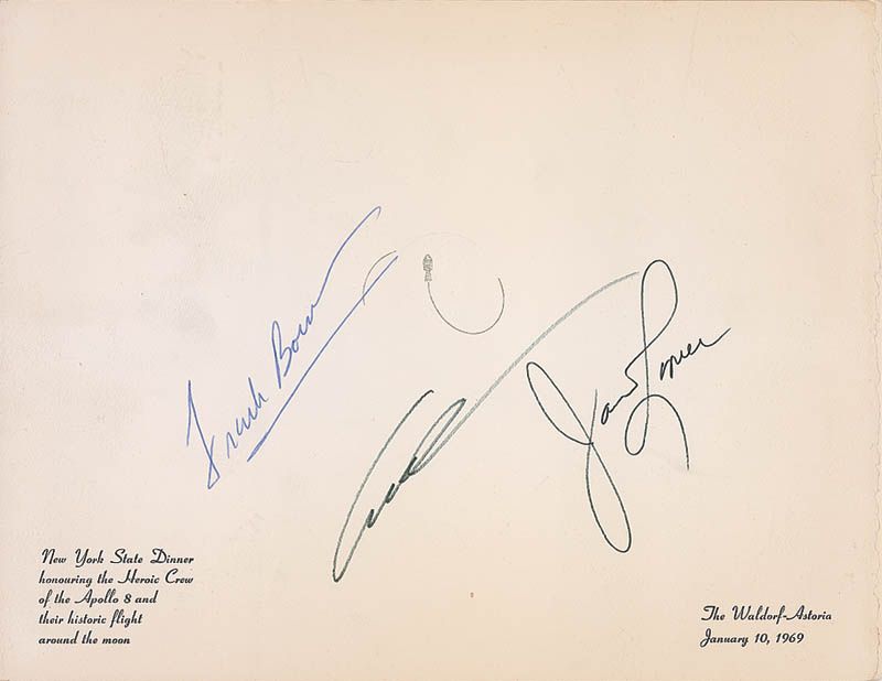 Presentation photo folder, 11 x 8.5, from the New York State Dinner honoring the Apollo 8 crew at the Waldorf-Astoria on January 10, 1969, with a color photo of the Earthrise taken from orbit inside, signed on the front cover in black felt tip by James Lovell and Bill Anders, and in blue ballpoint by Frank Borman. Accompanied by the menu/program from the event. In fine condition, with a bit of scattered light toning and a few bends.